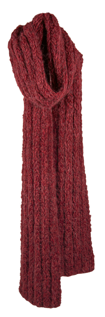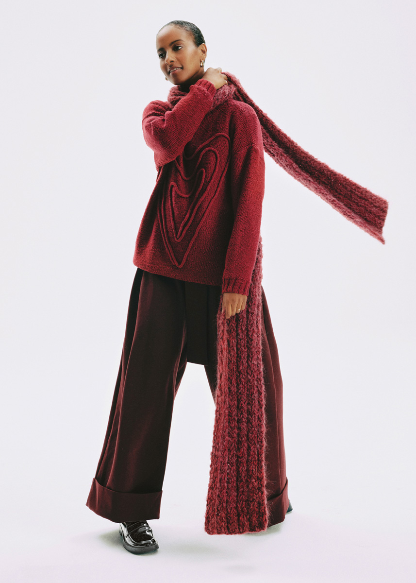 250 г цвета бургундского вина (цв. 24) пряжи Lala Berlin Furry (90% альпака бэби, 10% полиами- да, 75 м/50 г) и 150 г темно-красной (цв. 1) пряжи Cool Merino (90% шерсти мерино экстрафайн, 10% полиамида, 150 м/50 г) фирмы Lana Grossa; прямые спицы № 10.