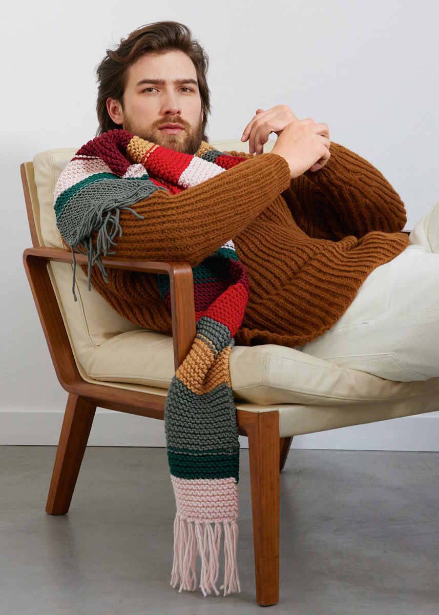 100 г цвета хаки (цв. 94), 100 г пастель- но-розовой (цв. 102), 100 г цвета красного вина (цв. 91), 100 г ярко-красной (цв. 42), 50 г бутылочно-зеленой (цв. 57) и 50 г абрикосовой (цв. 98) пряжи Superbingo (100% шерсти, 55 м/50 г) фирмы Lana Grossa; прямые спицы № 7 и крючок № 5 для привязывания кистей