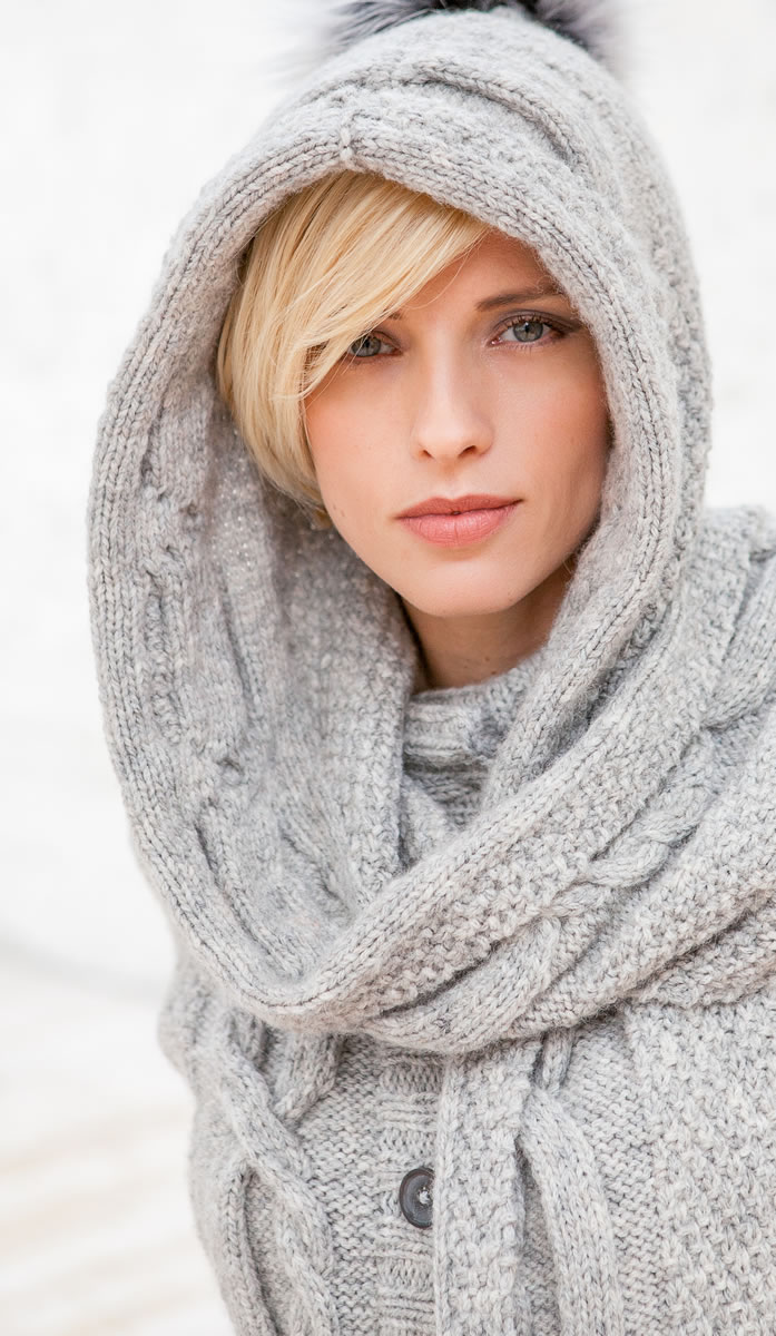 Снимите шляпу, она Вам не понадобится. Этот мягкий, широкий шарф с капюшоном станет Вашим верным спутником в прохладную погоду и защитит от ненастья. Кстати, он прекрасно сочетается с жакетом со стр.