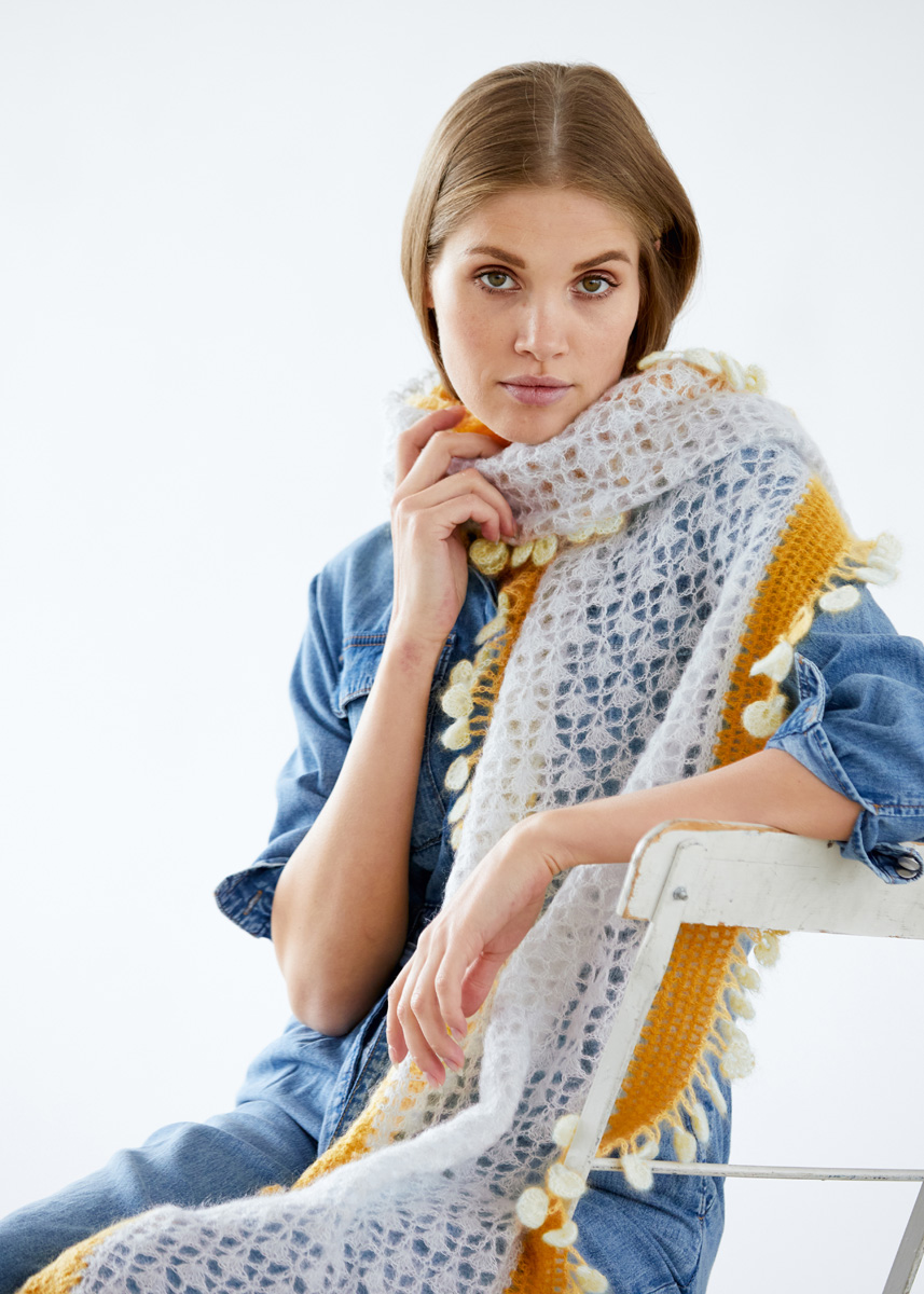 75 г серебристо-серой (цв. 41), 50 г янтарной (цв. 146) и 50 г бе- лой суровой (цв. 52) пряжи Silkhair (70% мохера, 30% шелка, 210 м/25 г) фирмы Lana Grossa; крючок № 4