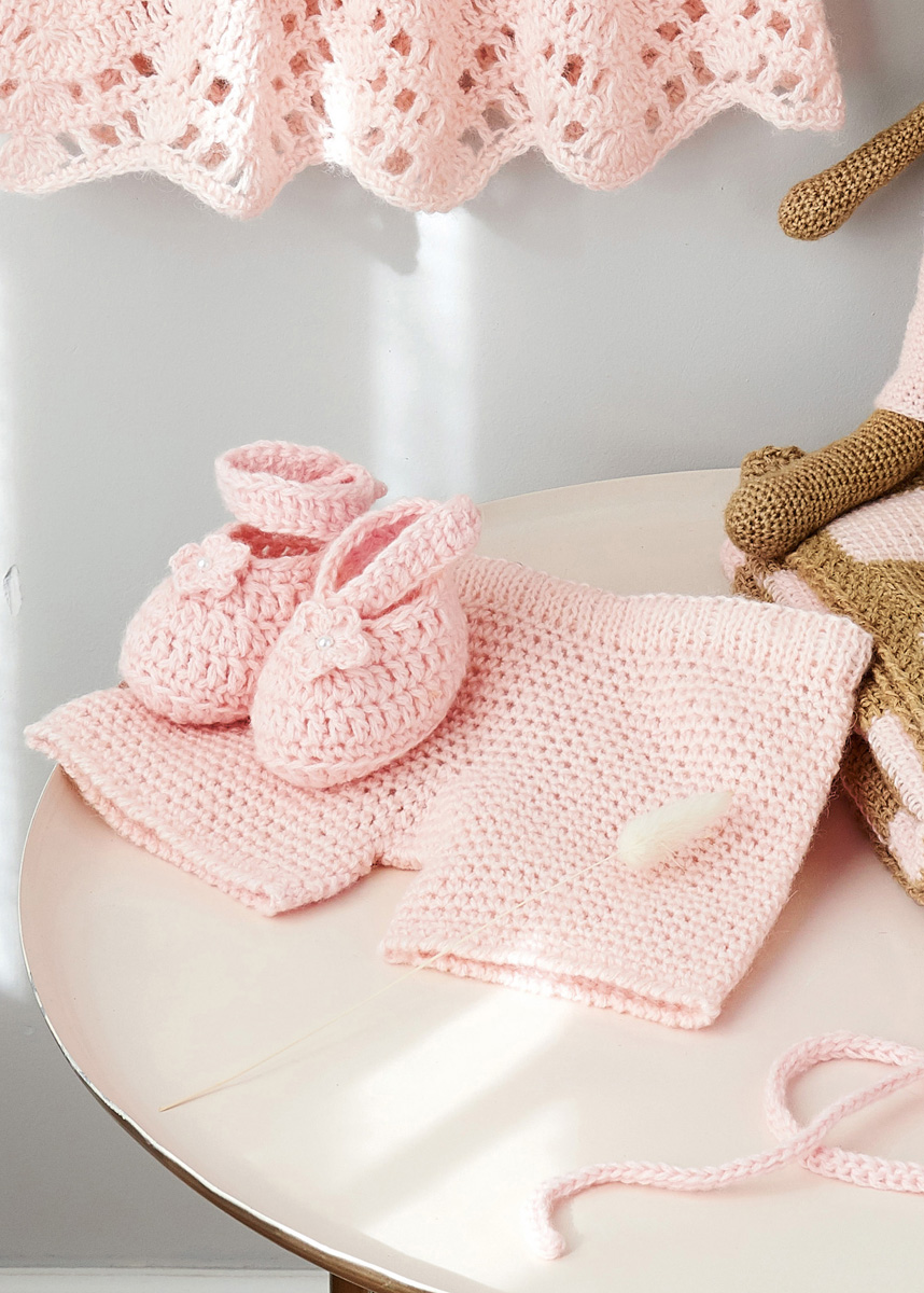 50 г пастельно-розовой (цв. 15) пряжи Allora (76% хлопка, 14% овечьей шерсти (ме- риносовой шерсти суперфайн), 10% шерсти (ягненка) альпака, 300 м/50 г) фирмы Lana Grossa; крючок № 3,5, круговые спицы № 3,5; эластичная тесьма шириной 2 см и длиной, равной обхвату талии