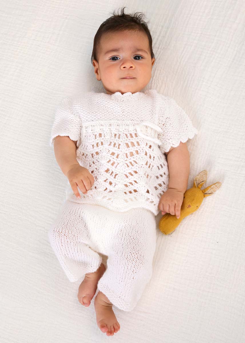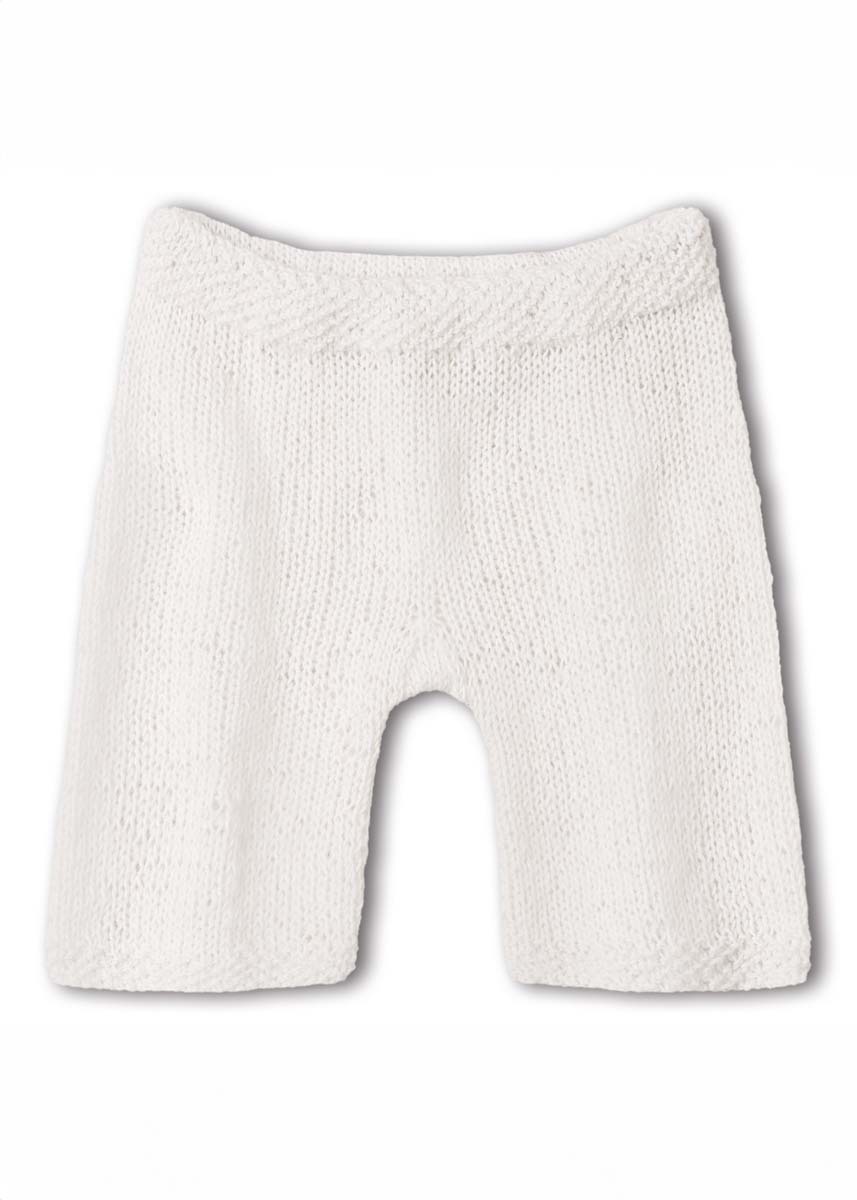 50 (50/100/100) г белой (цв. 207) пряжи Cool Wool Baby (100% шерсти мерино экстра- файн, 220 м/50 г) фирмы Lana Grossa; круговые спицы № 3 и № 3,5; бельевая резинка шириной 10 мм и длиной примерно 50 (50/50/60) см