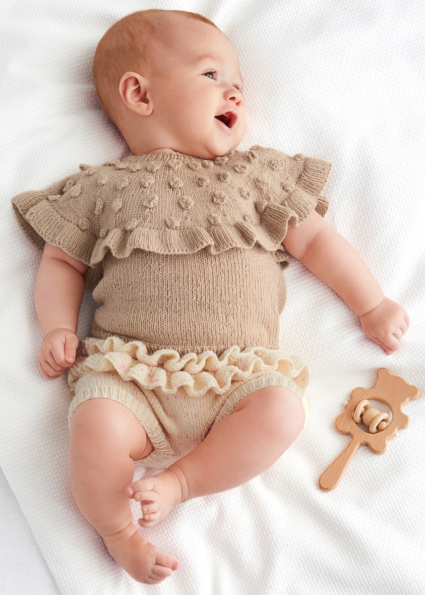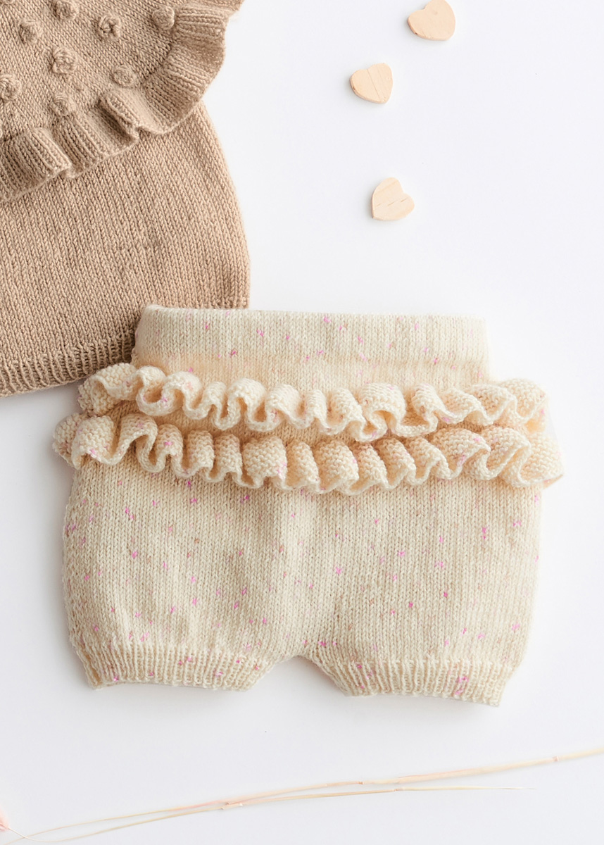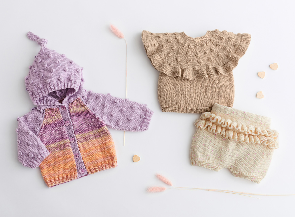 100 (100/150/150) г белой суровой/сиреневой/розовой/ ягодной (цв. 353) пряжи Cool Wool Baby Print Punto (100% шерсти, 220 м/50 г) фирмы Lana Grossa; прямые спицы № 2,5 и № 3, эластичная тесьма шириной 2 см и длиной, равной обхвату талии