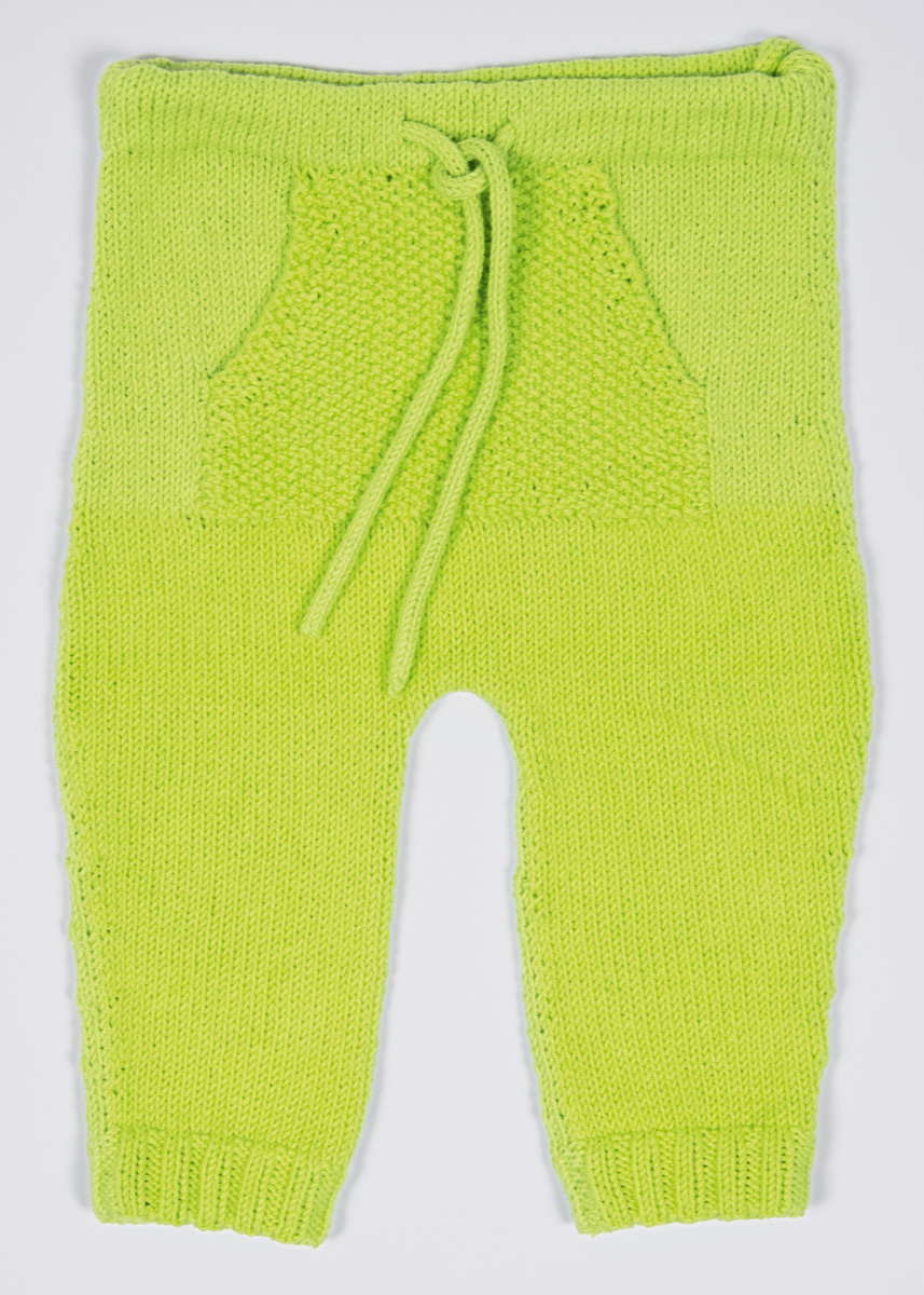 100 (100/150/150) г ядовито-зеленой (цв. 113) пряжи Elastico (96% хлопка, 4% полиэстера, 160 м/50 г) фирмы Lana Grossa; прямые спицы № 3 и № 3,5, чулочные спицы № 3.