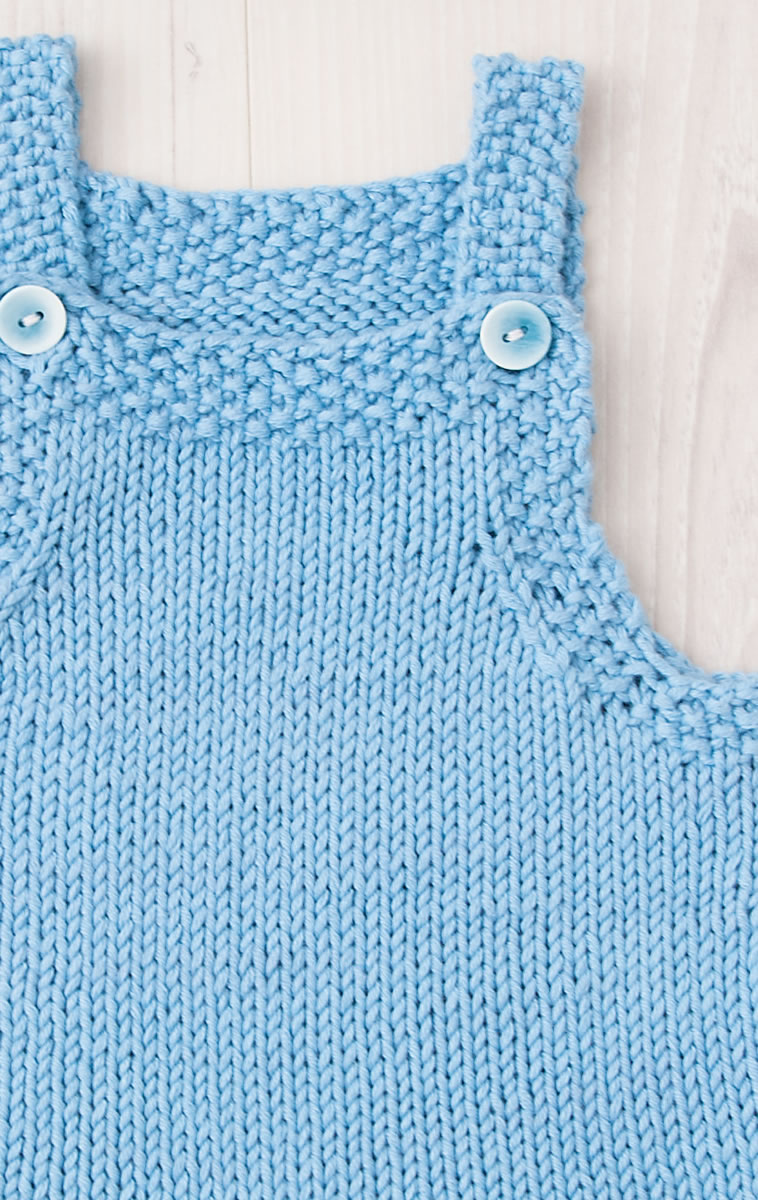 150 г средне-синей (цв. 50) и 50 г белой (цв. 7) пряжи Organico (100% хлопка, 90 м/50 г) фирмы Lana Grossa; прямые спицы № 4,5; круг. спицы № 4,5 длиной 40 см; набор чулочных спиц № 4,5; 2 пуговицы.