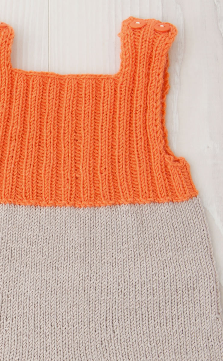 Пусть скорее наступит лето! Комбинезон, носочки и шапочка, связанные в сочетании оранжевого и песочного цветов, подарят вашей крохе хорошее настроение.