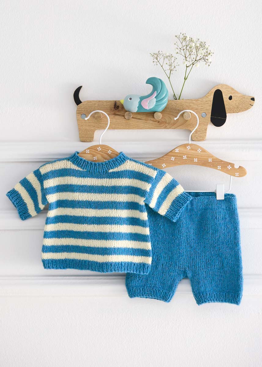 50 (50/100/100) г небесно-синей (цв. 09) пряжи Sottile (85% хлопка, 15% шерсти мерино, 250 м/50 г) фирмы Lana Grossa; круговые спицы № 2,5 и № 3; бельевая резинка шириной 10 мм и дли- ной примерно 50 (50/50/60) см.