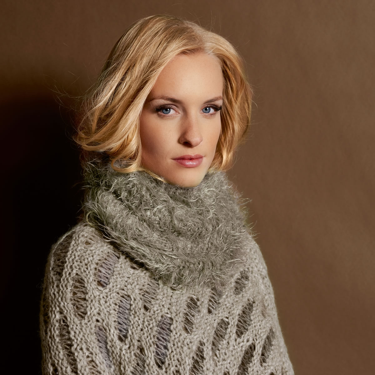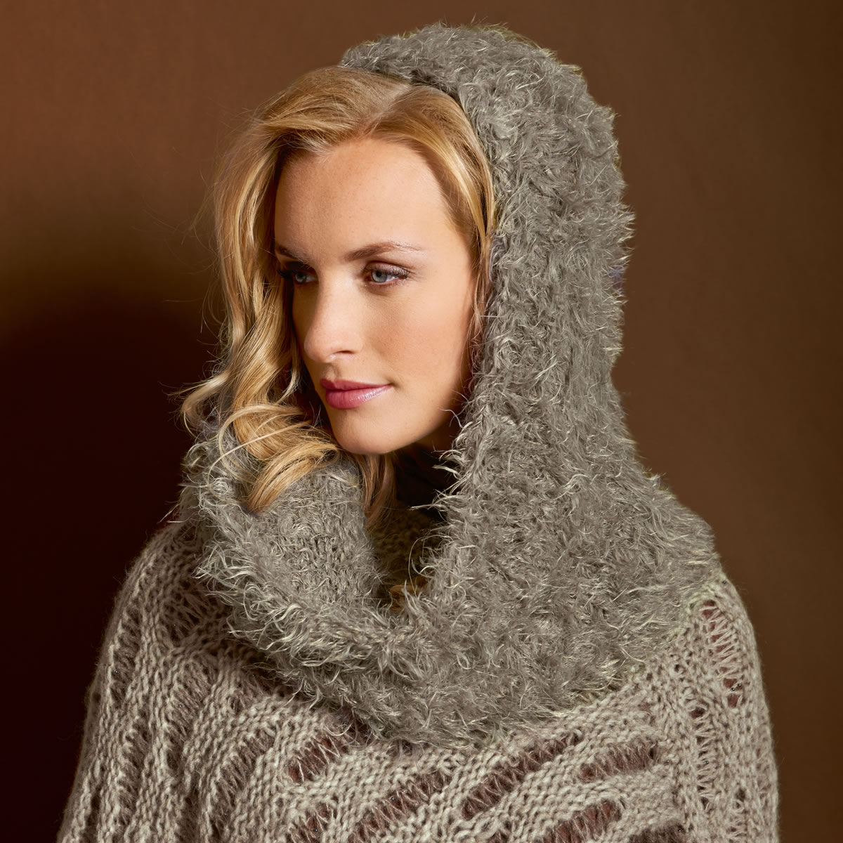 250 г серо-коричневой (цвет 2) пряжи Peppina фирмы Lana Grossa (60% полиамида, 25% шерсти мерино, 15% полиакрила, 85 м/50 г); круговые спицы № 8 длиной 60 см.