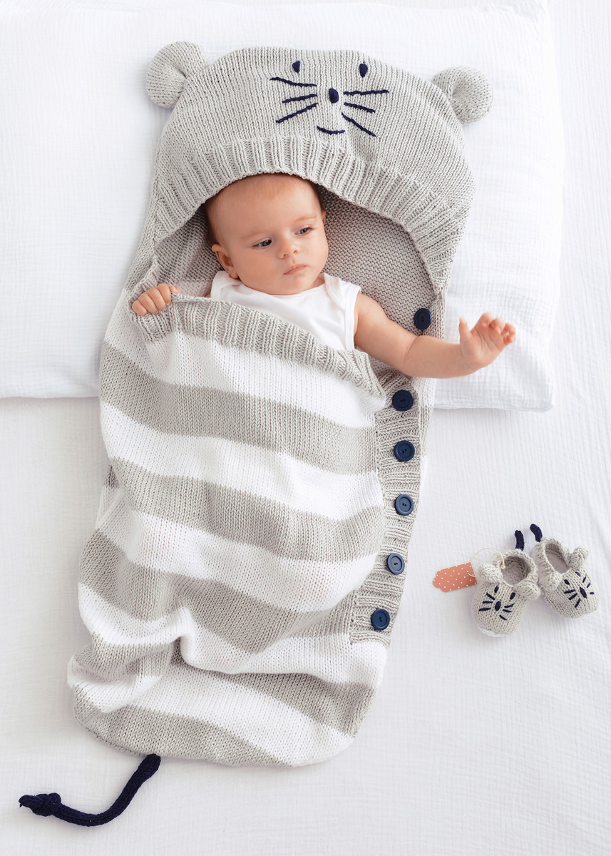 Lana Grossa Soft Cotton (70 % хлопок, 30 % полиакрил, длина нитки 140 m/50 g) 200 г светло серый (цв 18), 100 г белый (цв 10) и 50 г темно синий (цв 17); сп. № 4 и 4,5, кр. сп. № 4, длиной 40 см;6 кнопки 23 мм; ватка