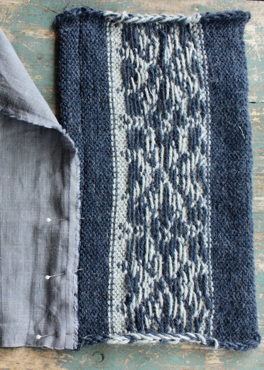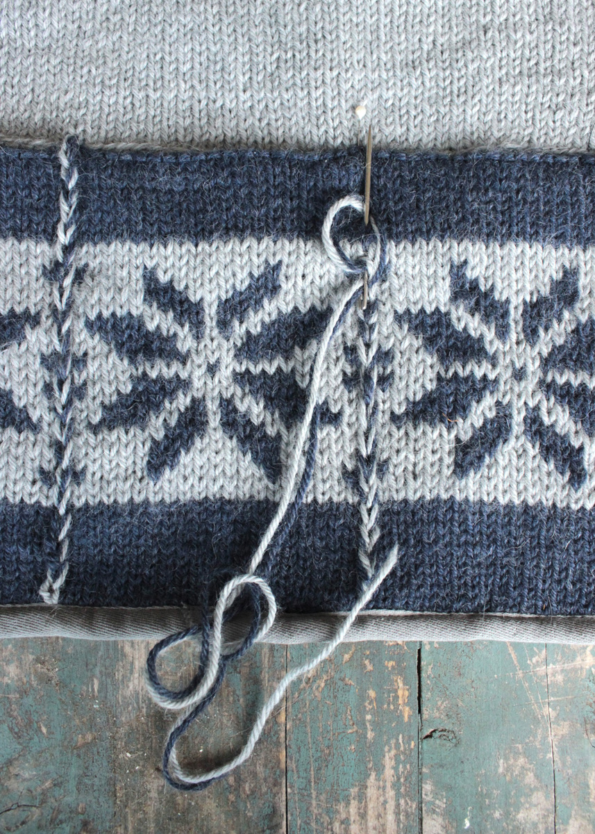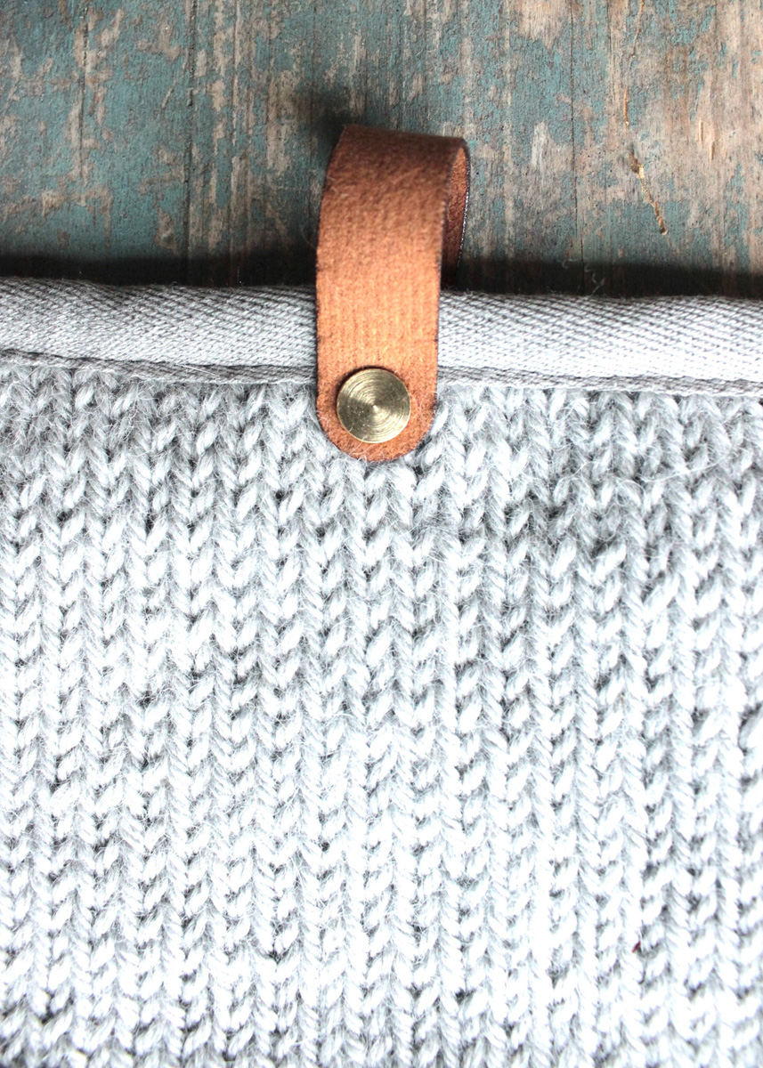 Lana Grossa-Qualität „Landlust-Alpaka-Merino 100“ (50% беби альпака, 50% шерсть меринос, длина нити 100 m/50 g), по 50 г светло серый (цв 307) и серо голубой (цв 311); сп. № 5; 55 x 40 см шнурка в светло сером, 135 см лента в сером, нитка для шитья, 3 кожаные подвески 10 x 1,5 cm, 1 ок. 45 см ветка дерева; швейная машина, утюг