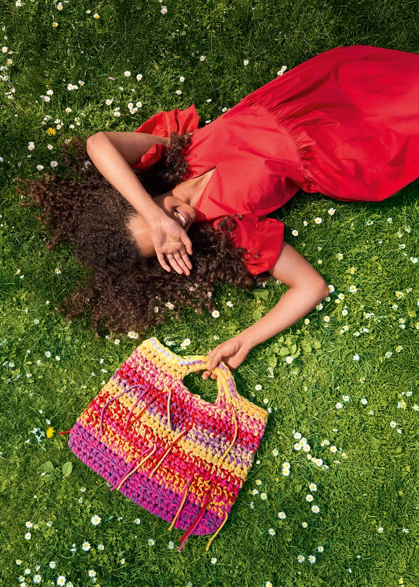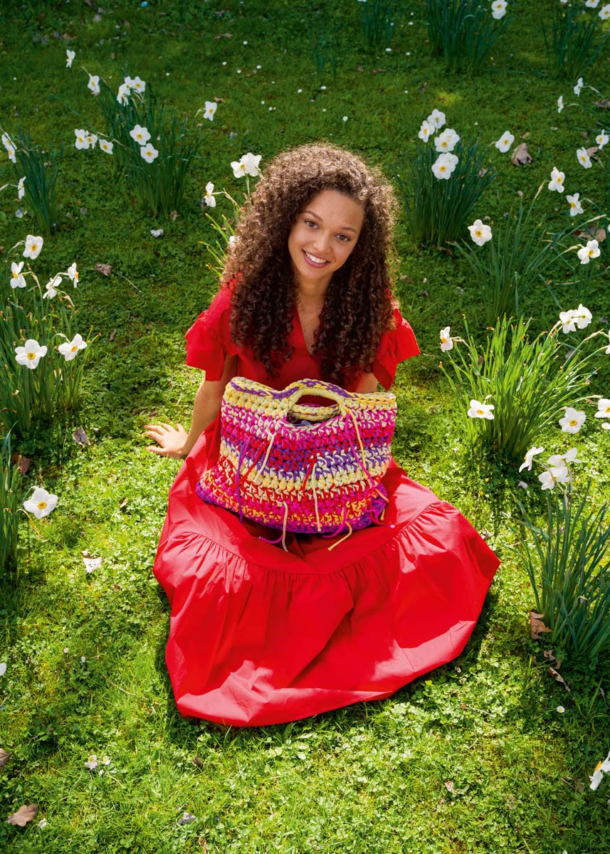 Lana Grossa The Tube (60 % хлопок, 40 % нейлон; длина нитки 114 m/200 g): по 200 г красный (цв 7), светло зелёный (цв 25), жёлтый (цв 24), фуксия (цв 8) и фиалка (цв 20); крючок № 12