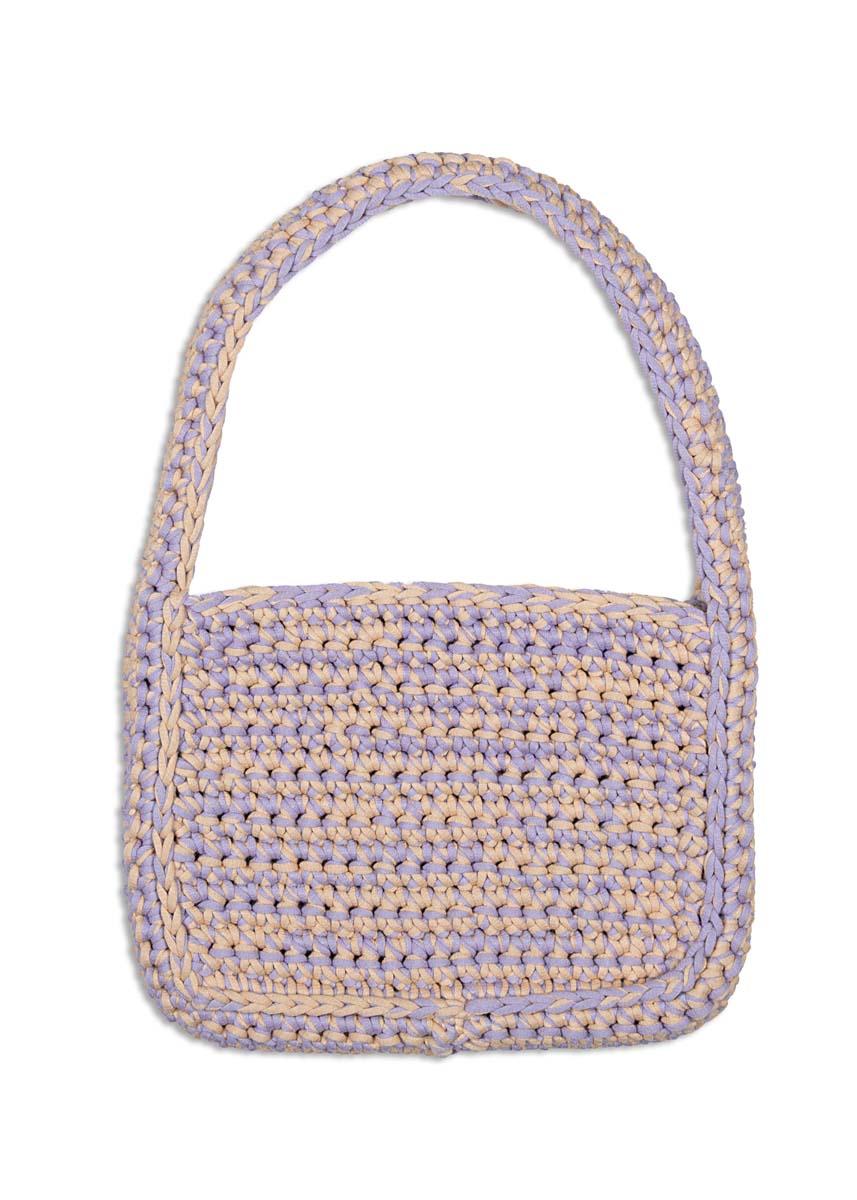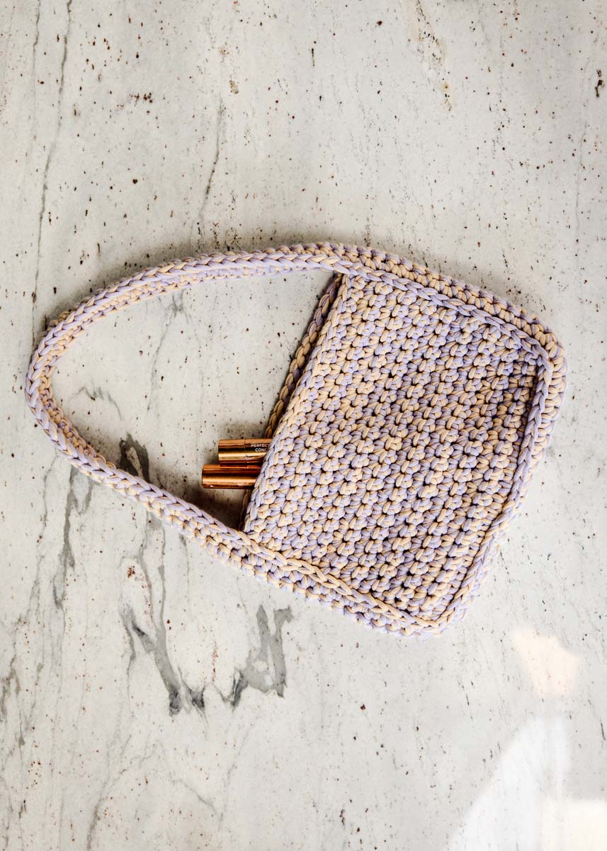 по 100 г лиловой (цв. 109) и бежевой (цв. 125) пряжи The Tube Fine (68% хлопка, 32% полиамида, 140 м/100 г) фирмы Lana Grossa; крючок № 6.
