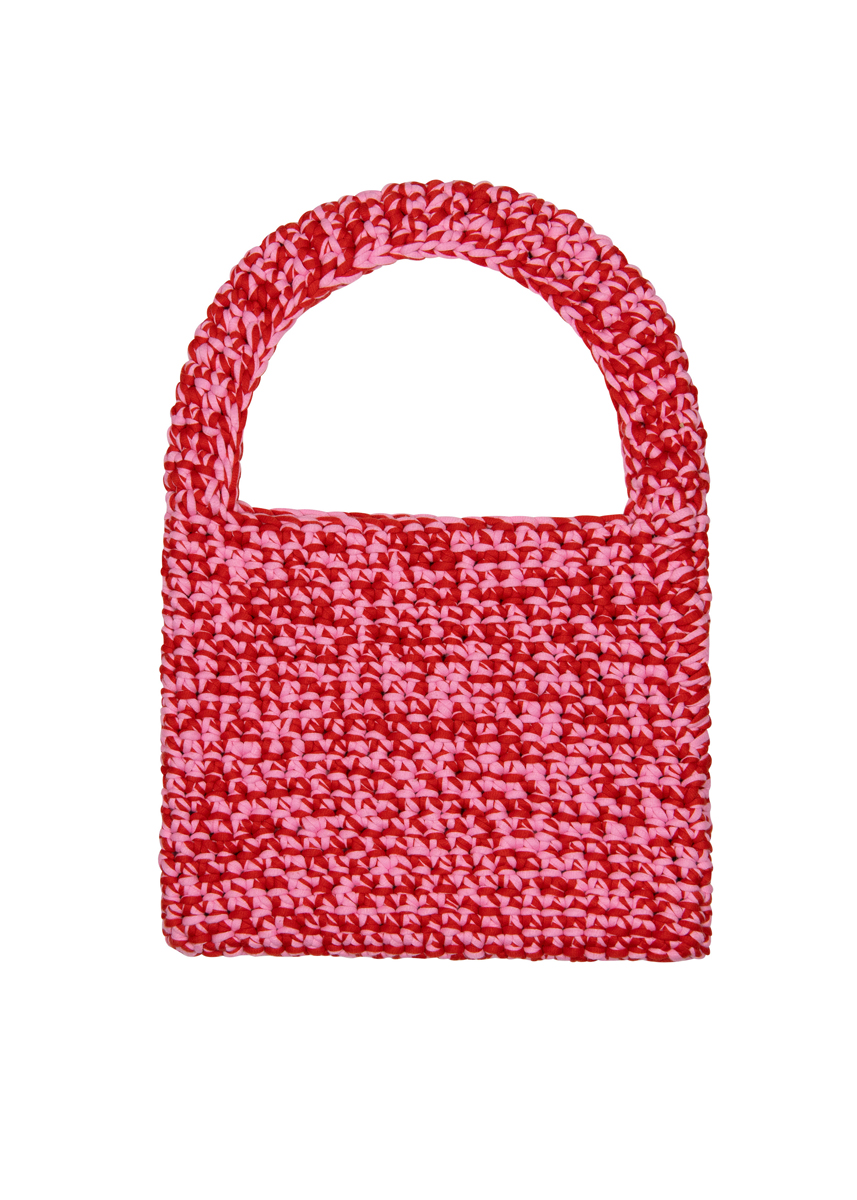 Lana Grossa-Qualität „The Tube” (60 % хлопок, 40 % нейлон, длина нити = ок. 114 m/200 g): по ок. 400 г Rot (цв. 7) и розовый (цв. 19); 1 крючок № 8.