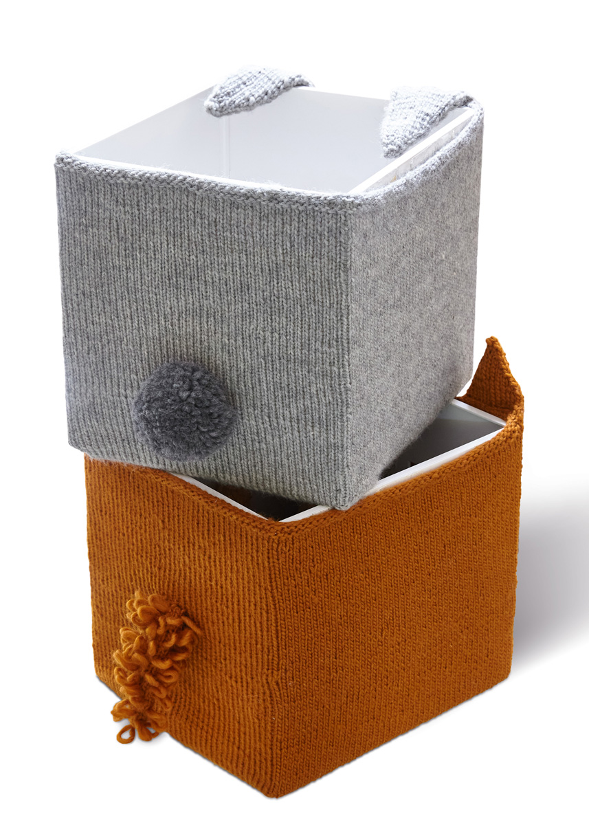 Lana Grossa-Qualität „Feltro” (100 % шерсть, длина нити 50 m/50 g): для „лисенка“: ок. 550 г серый меланжевый (цв. 3) и 50 г тёмно-серый меланжевый (цв. 4), кр. сп. № 5,5, 60 и 100 см длиной, 1 крючок № 6; 1 игла от Lana Grossa; 1 пара очков Union Knopf, Art. 45462, ø 23 мм, цв. 20 коричневый (лисенок), цв. 66 серый (кролик); 2x Prym Elastic-Kordel (для всех 3 нав.), ø 1,5 мм, 3 м длина, арт. 971068 в бежевом; 3 коробки IKEA „DRÖNA“, арт. 402.179.55, белый, размер по 38 x 33 x 33 см (д x ш x в)