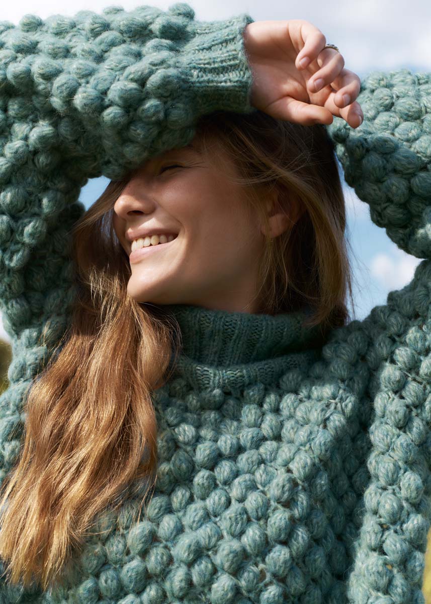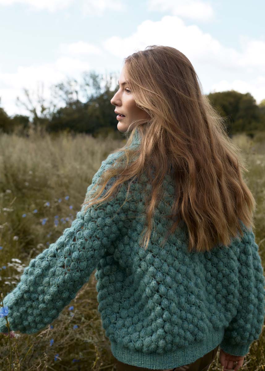 450 (500–550) г мятно-серой (цв. 4) пряжи Airy (42% альпака бэби, 40% хлопка, 18%шерсти мерино экстрафайн, 170 м/50 г) фирмы Lana Grossa; крючок № 6, круговые спицы № 4 и № 4,5 длиной 40 см, круговые спицы № 4 длиной 80 см.