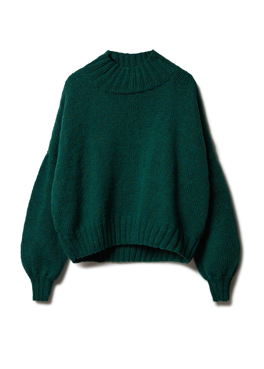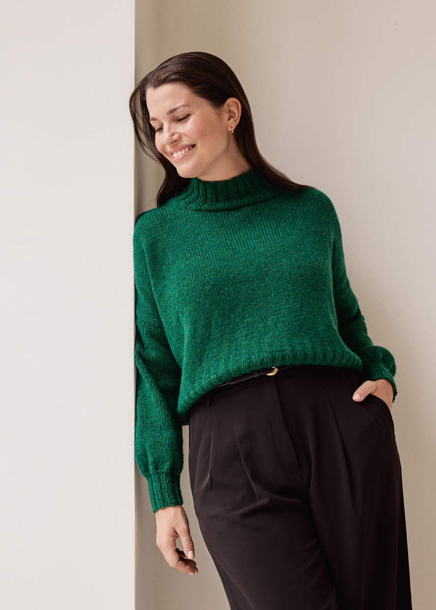 400 (450–500–550) г темно-зеле- ной (цв. 102) пряжи Alta Moda Alpaca (90% альпака бэби, 5% шерсти мерино, 5% полиамида, 140 м/50 г) фирмы Lana Grossa; прямые спицы № 4,5 и № 6,5, а также круговые спицы № 4,5 длиной 40 см.