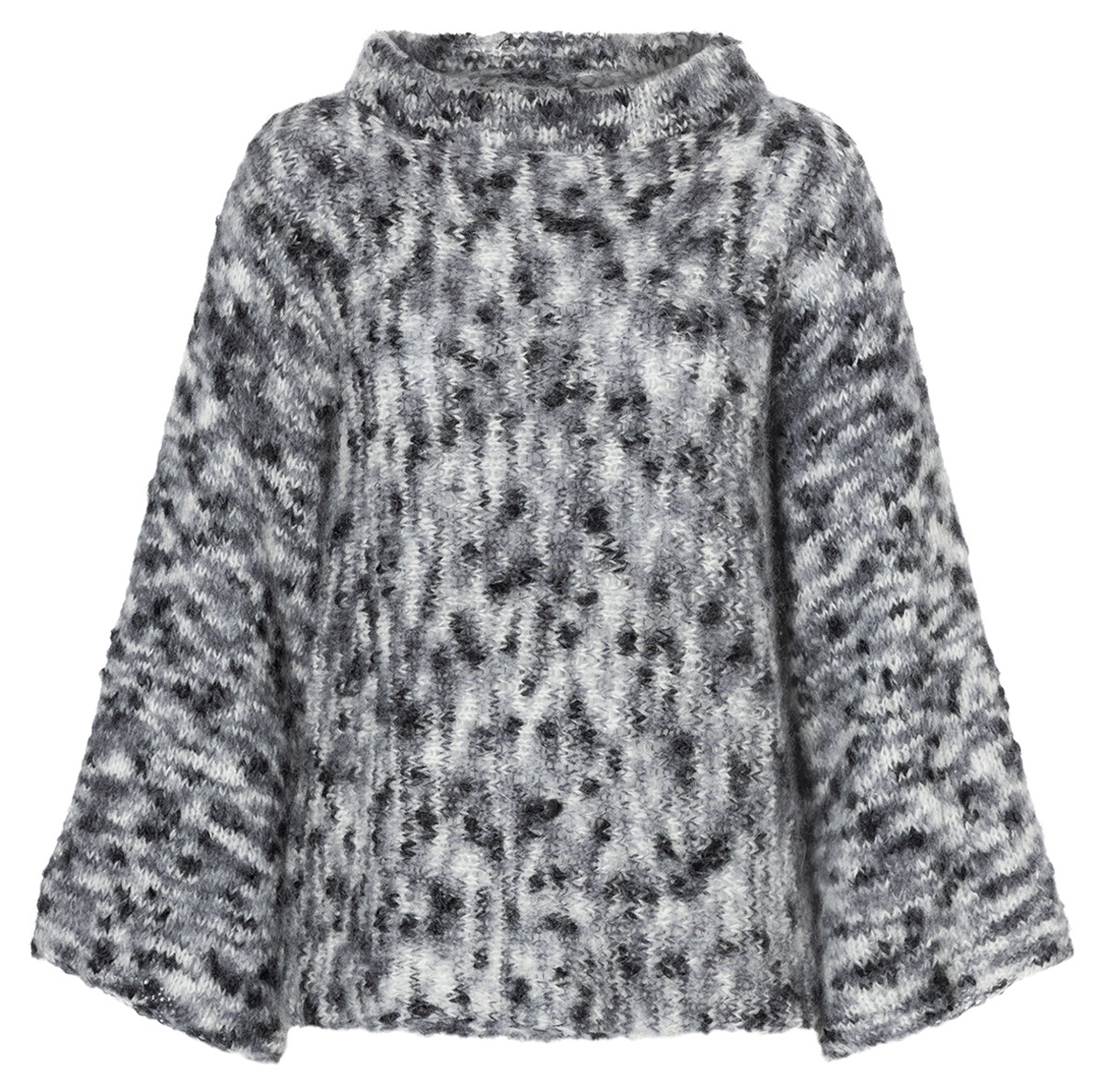 300 (350–400) г белой суровой/светло-/средне-/темно-серой/ черной (цв. 106) пряжи Lala Berlin Brushy (42% мохера (суперкид), 38% овечьей (мериносовой) шерсти, 20% полиамида, 135 м/50 г) фирмы Lana Grossa; прямые спицы № 6, круговые спицы № 6 длиной 50 и 100 см