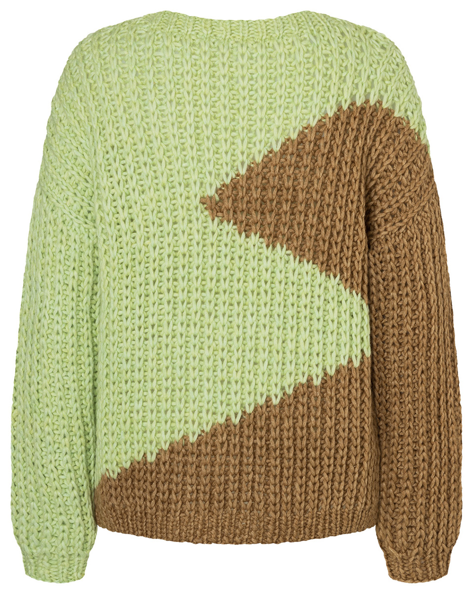 по 250 (300) г цвета нуги (цв. 4) и бело-зеленой (цв. 22) пря- жи Lala Berlin Lovely Cotton (75% овечьей шерсти (мериносовой шерсти суперфайн), 25% хлопка, 90 м/50 г) фирмы Lana Grossa; прямые спицы № 7 и № 10, круговые спицы № 7 длиной 50 см