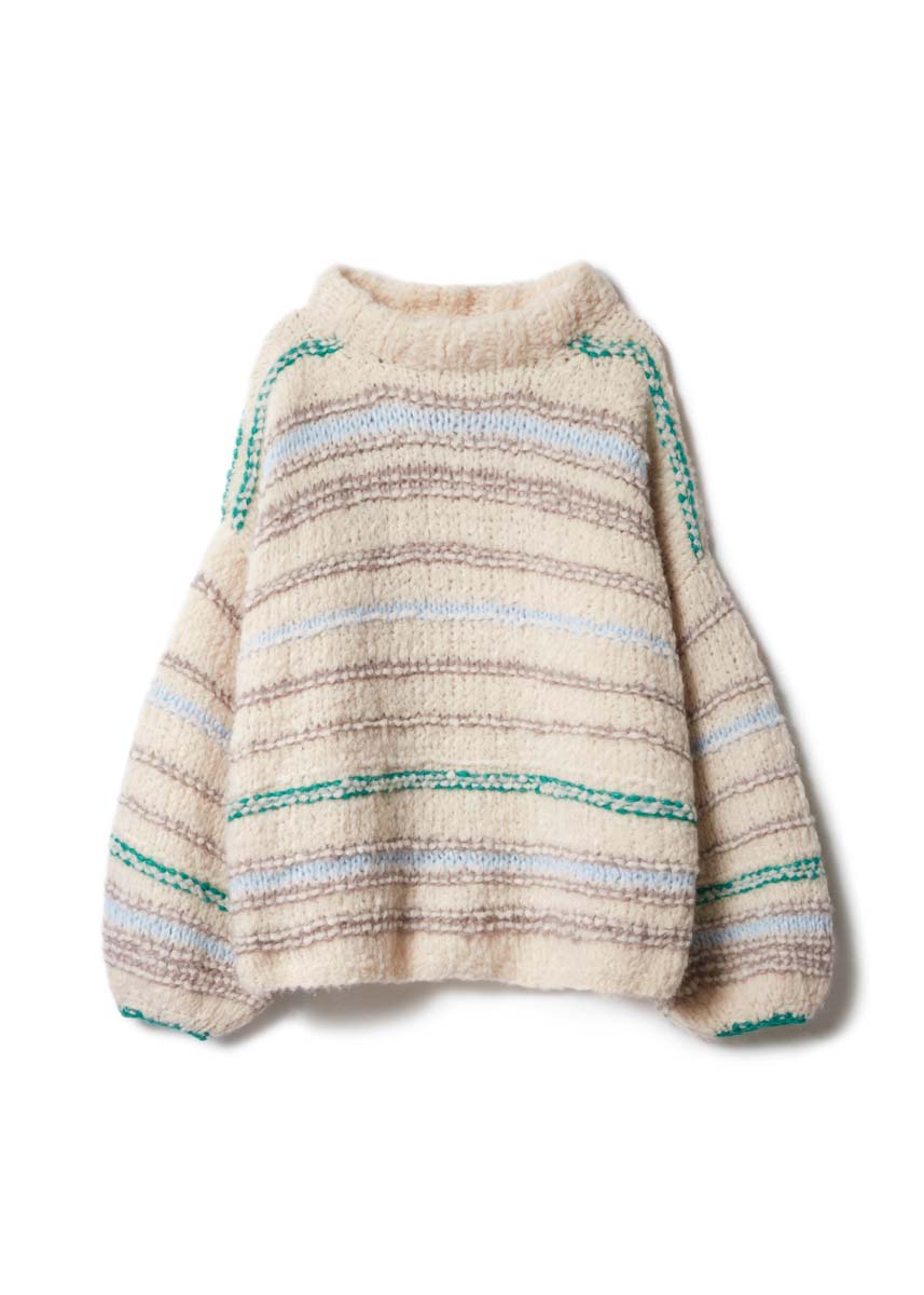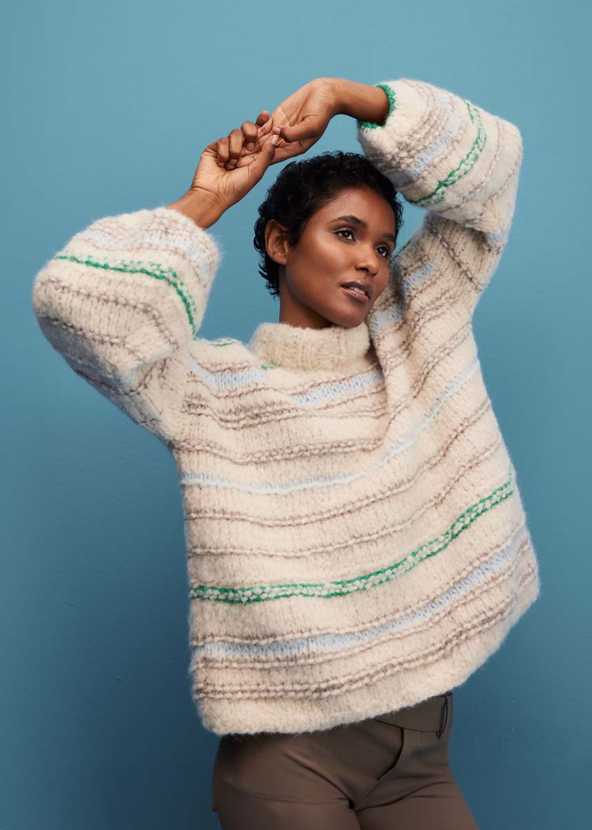 250 (300) г светло-бе- жевой (цв. 2) пряжи Royal Alpaca (93% альпака royal, 7% полиамида, 95 м/50 г), а также 100 г светло-бежевой (цв. 26), по 50 г бледно-зеленой (цв. 24) и пастель- но-синей (цв. 28) пряжи Alpaca Air (62% альпака бэби, 27% полиамида, 11% шер- сти мерино экстрафайн, 140 м/50 г) фирмы Lana Grossa; прямые спицы № 8, круговые спицы № 8 длиной 50 см