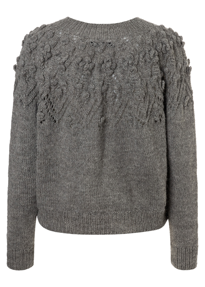 450 г темно-серой (цв. 103) пряжи Natural Alpaca Classico (85% альпака бэби, 15% шерсти мерино, 125 м/ 50 г) фирмы Lana Grossa; прямые спицы № 4,5 и № 5,5, круговые спицы № 4,5 длиной 40 см, круговые спицы № 5,5 длиной 40 см, 60 см и 80 см, 1 вспомогательная спи- цами для кос, маркер для петель