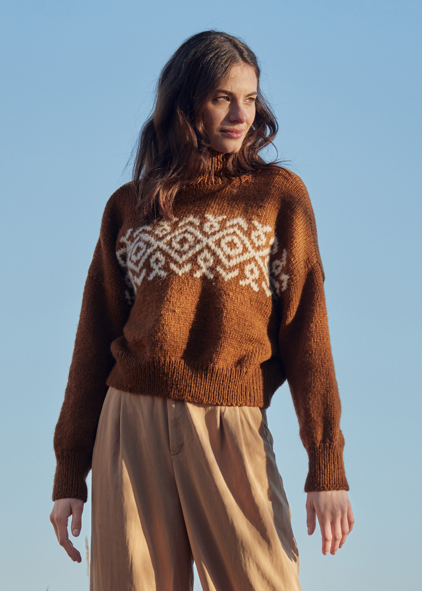 50 (50–100–100) г белой (цв. 1) пряжи Alpaca Moda (74% альпака бэби, 13% шерсти мерино, 13% полиамида, 135 м/50 г) и 500 (550–550– 600) г цвета нуги (цв. 215) пряжи Cool Merino Big (90% шерсти мерино, 10% полиамида, 90 м/50 г) фирмы Lana Grossa; прямые спицы № 4 и № 6, короткие круговые спицы № 4.