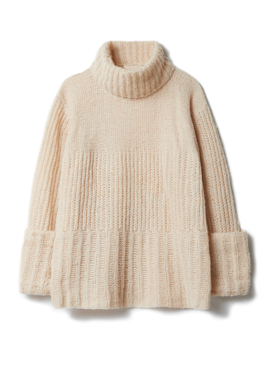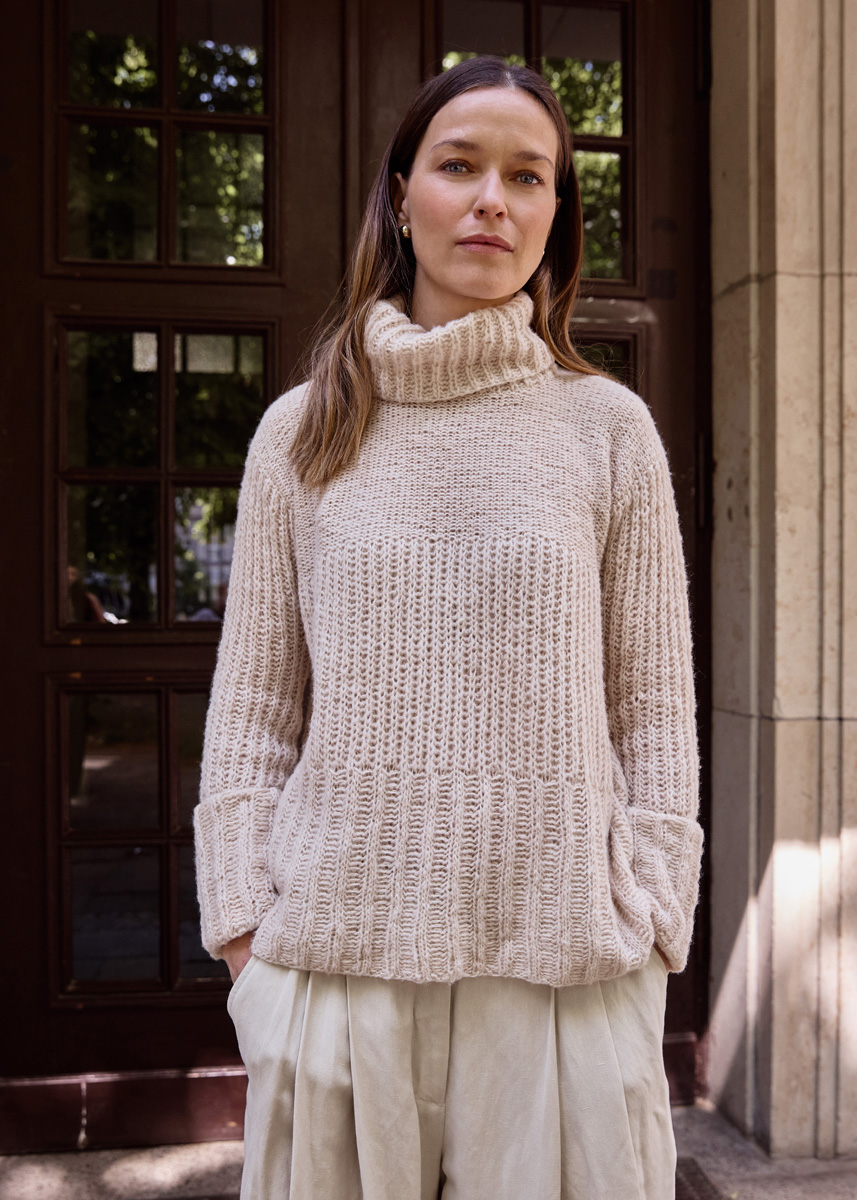 275 (300–325) г светло-бежевой (цв. 17) пряжи Soffio (60% шерсти мерино суперфайн, 30% хлопка органического (эко), 10% кашемира, 212 м/25 г) фирмы Lana Grossa; прямые спицы № 5 и круго- вые спицы № 5 длиной 40 см