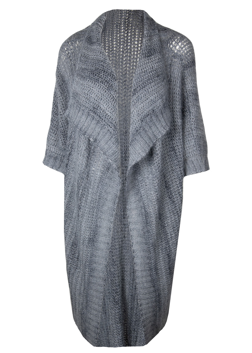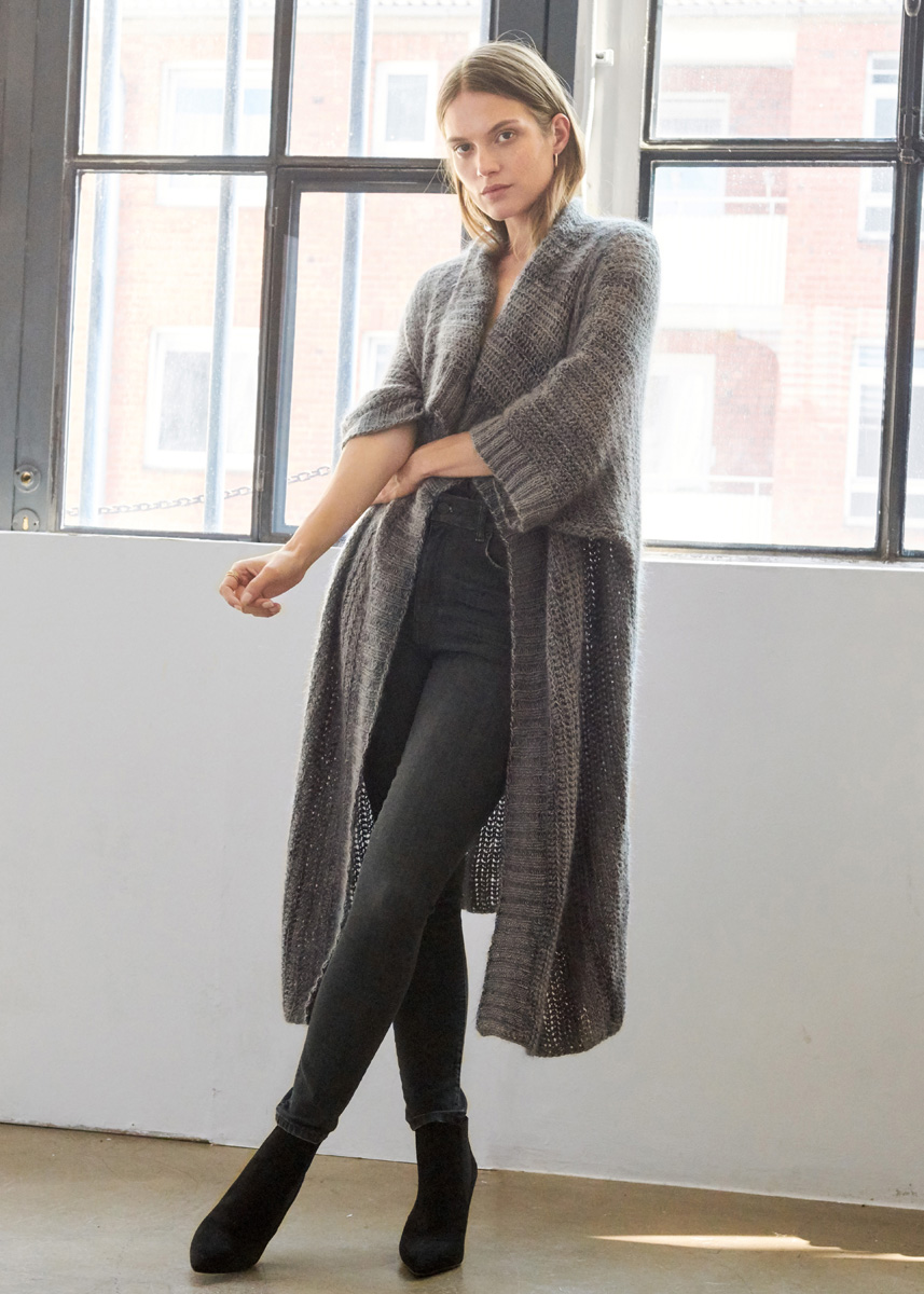 550 (550–600) г серой (цв. 14) пряжи Lace Seta Mulberry (35% (тутового) шелка, 35% шерсти (ягненка) аль- пака, 30% овечьей (мериносовой) шерсти, 175 м/50 г) и 200 (200–250) г серой/цвета антрацита (цв. 1108) пряжи Silkhair Haze Dégradé (70% мохера (суперкид), 30% шел- ка, 425 м/50 г) фирмы Lana Grossa; крючок № 5 и № 7, круговые спицы № 4,5 длиной 60 и 100 см.