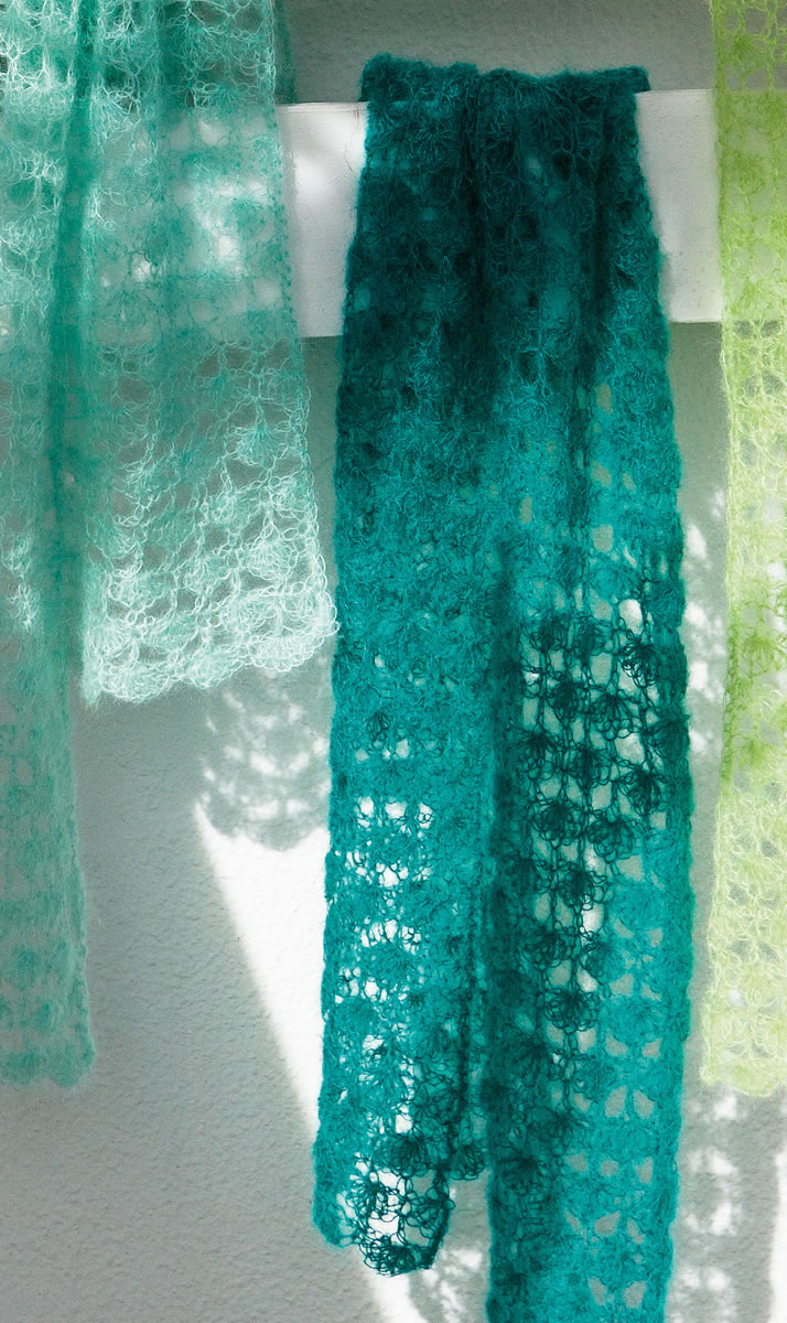 по 50 г серебристо-серой (цв. 41), светло-зеленой (цв. 54), мятной (цв. 53) и изумрудной (цв. 22) пряжи Silkhair (70% мохера (королевского мохера), 30% шелка, 210 м/25 г) фирмы Lana Grossa; крючок № 5 и № 6.