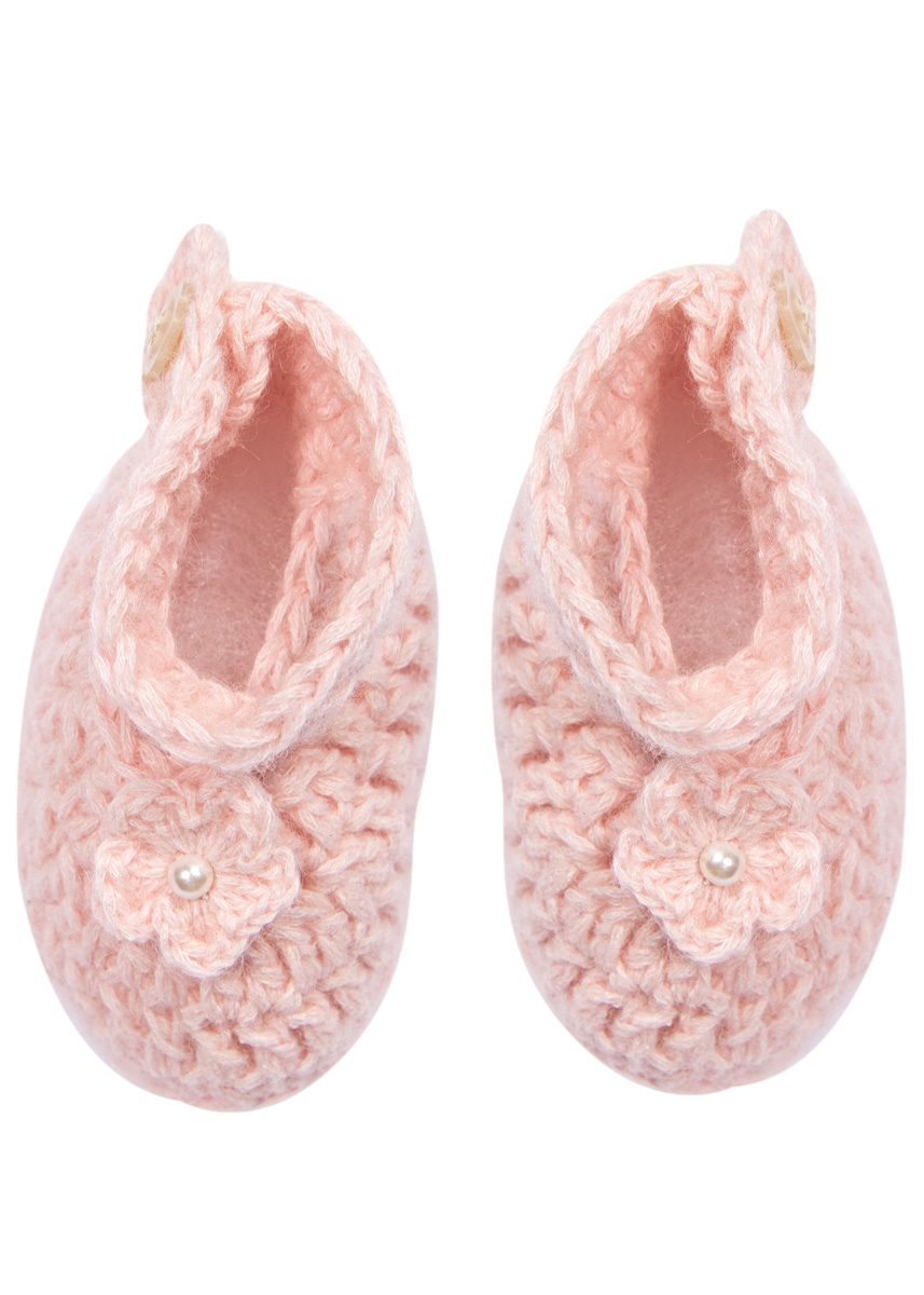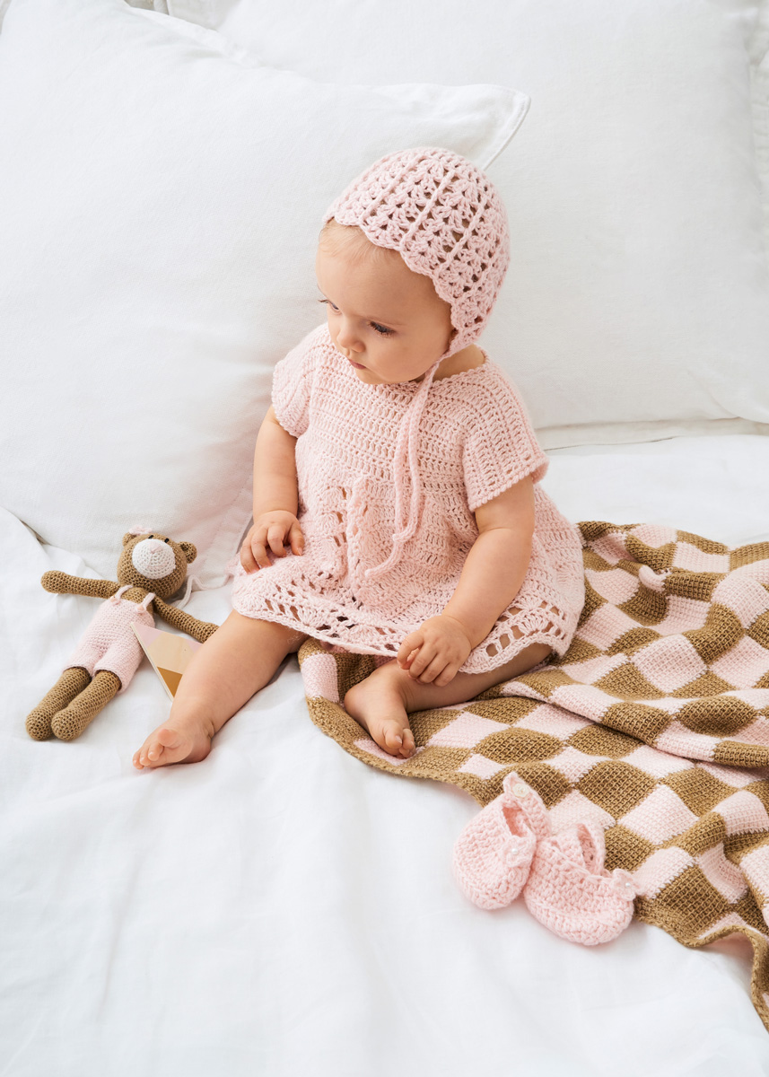 50 г пастельно-розовой (цв. 15) пряжи Allora (76% хлопка, 14% овечьей шерсти (ме- риносовой шерсти суперфайн), 10% шерсти (ягненка) альпака, 300 м/50 г) фирмы Lana Grossa; крючок № 3 и № 3,5; две пуговицы диаметром 12 мм и 2 бусины диаметром 6 мм
