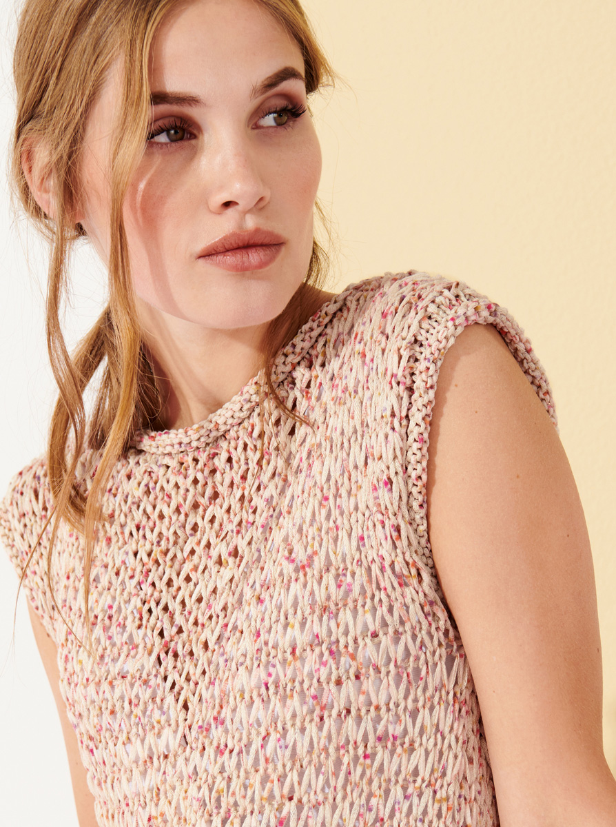 150 (200) 250 г бледно-розовой/ярко-розовой/лиловой/оранжевой/светло-оливковой (цв. 4) пряжи About Berlin Sparkly (82% хлопка, 18% полиэстера, 120 м/50 г) и 150 (200) 250 г бело-бежевой (цв. 1) пряжи About Berlin Chilly (100% льна, 95 м/50 г) фирмы Lana Grossa; прямые спицы № 7, круговые спицы № 8 длиной 80 см, круговые спицы № 5,5 длиной 40 см
