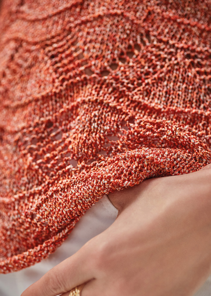 Lana Grossa Alessia (76% хлопок, 20% переработанный полиэстер, 4% полиэстер, длина нити 135 m/50 g), 250 (300 – 350) г золотой/медь/серо-зеленый/ мята (цв 102) или красный/оранжевый/цвет экрю (цв 11); сп. № 5 и 1 кр. сп. № 4, длиной 40 см