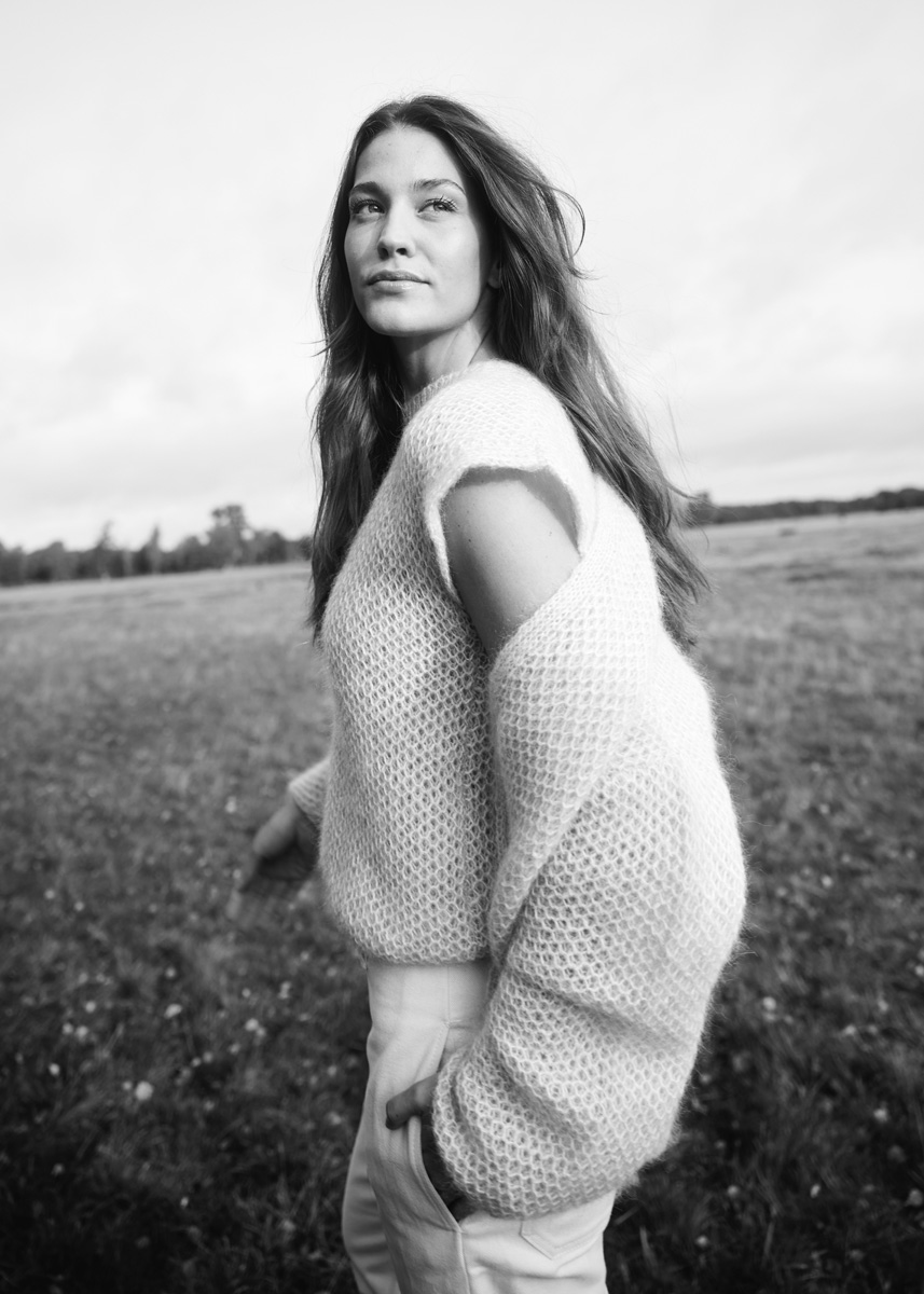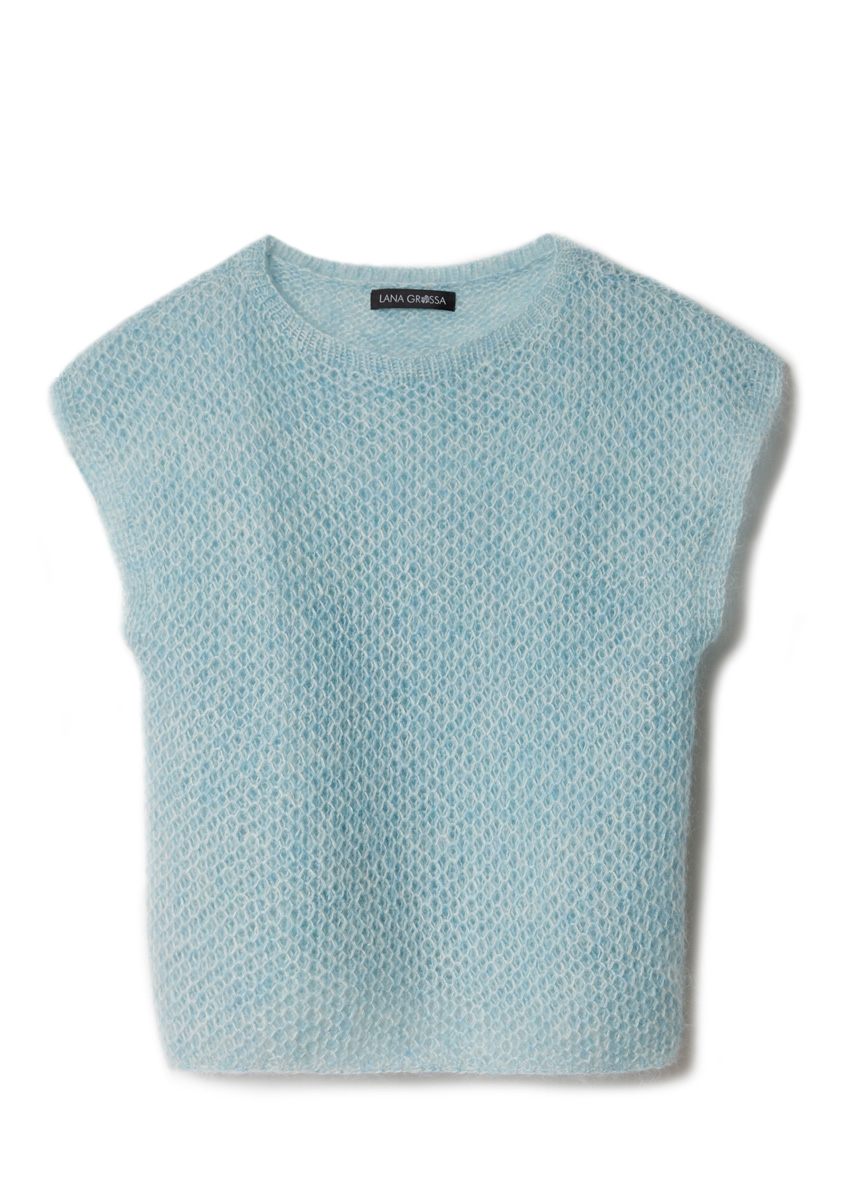 50 (75–75–100) г цвета аквамари- на (цв. 22) пряжи Bella (35% хлопка, 30% нейлона, 25% альпака бэби, 10% шерсти мерино, 250 м/25 г) фирмы Lana Grossa и 75 (100–100–125) г белой суровой (цв. 52) пряжи Silkhair (70% мохера суперкид, 30% шелка, 210 м/25 г) фирмы Lana Grossa; прямые спицы № 4,5, короткие круговые спицы № 3.