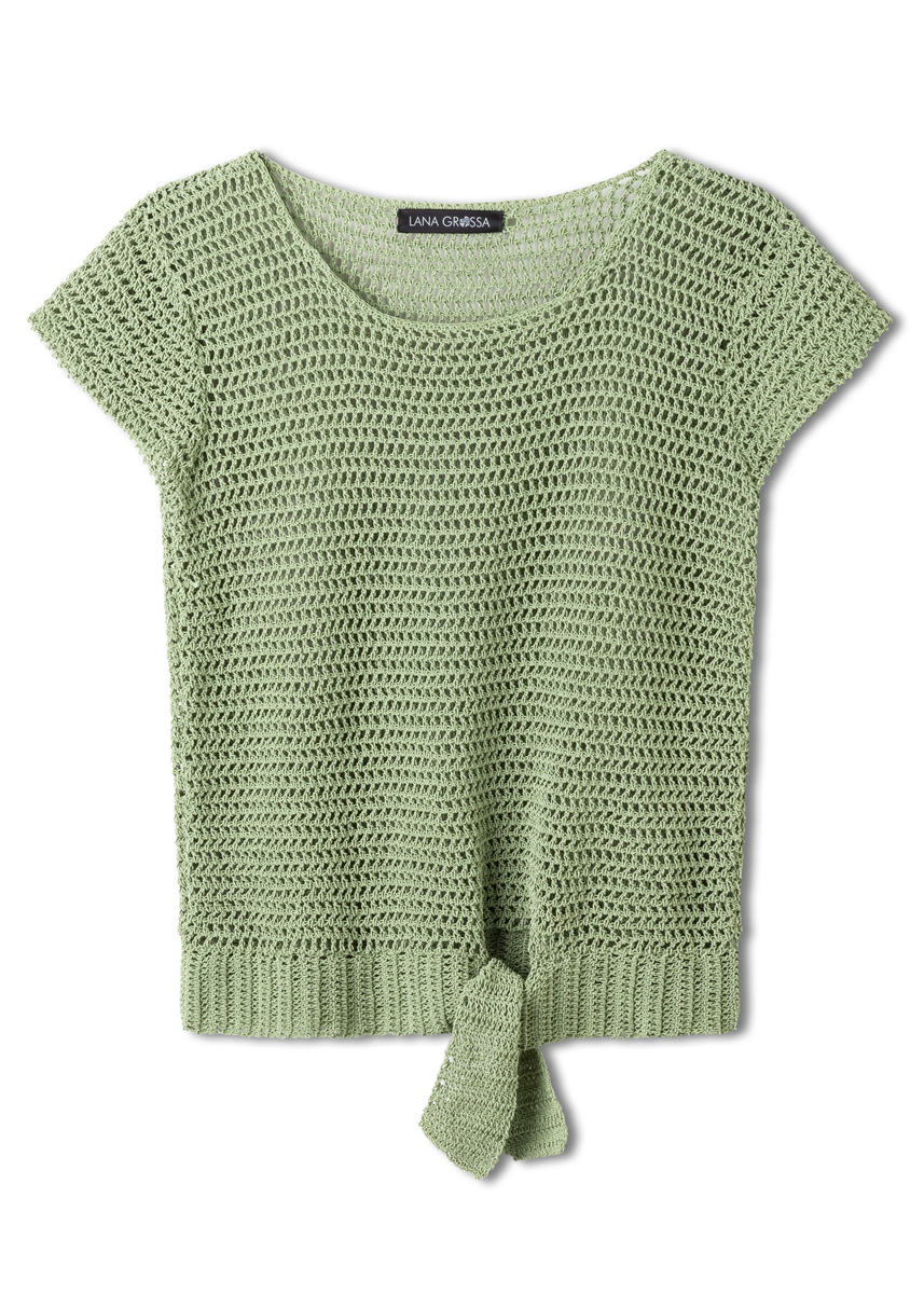 Lana Grossa-Qualität „Capri” (55 % хлопок, 30 % полиамид, 15 % шёлк, длина нити = ок. 150 m/50 g): ок. 300 (350) г пастельно-зелёный (цв. 43); 1 крючок № 3