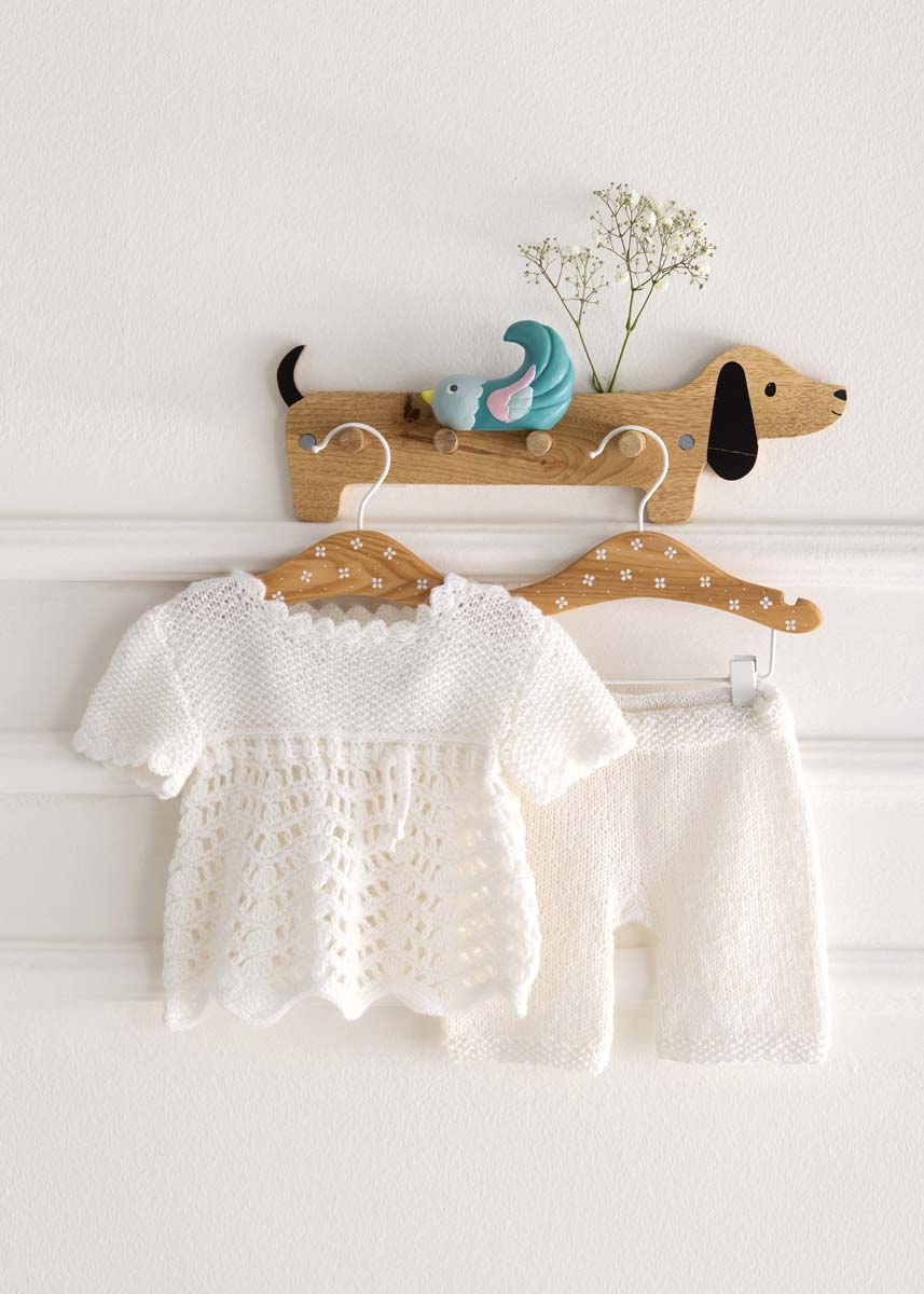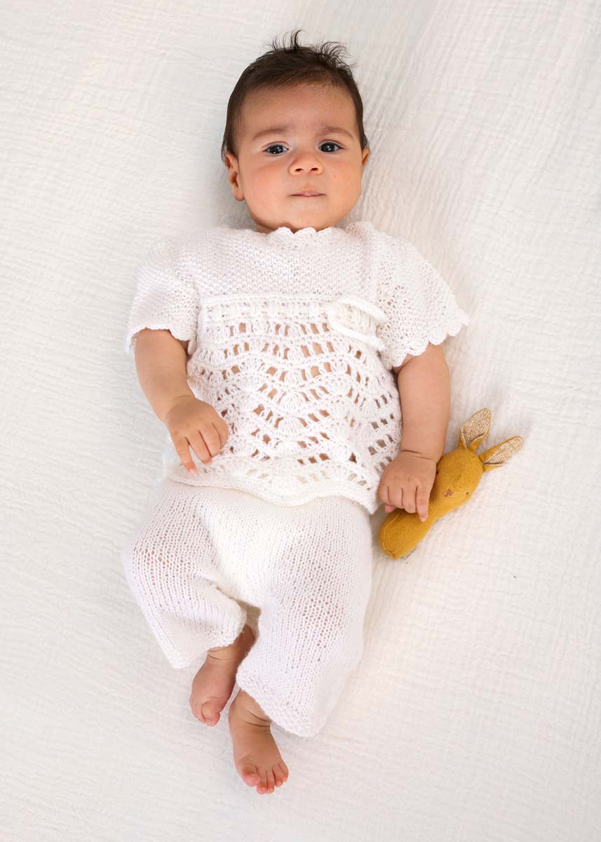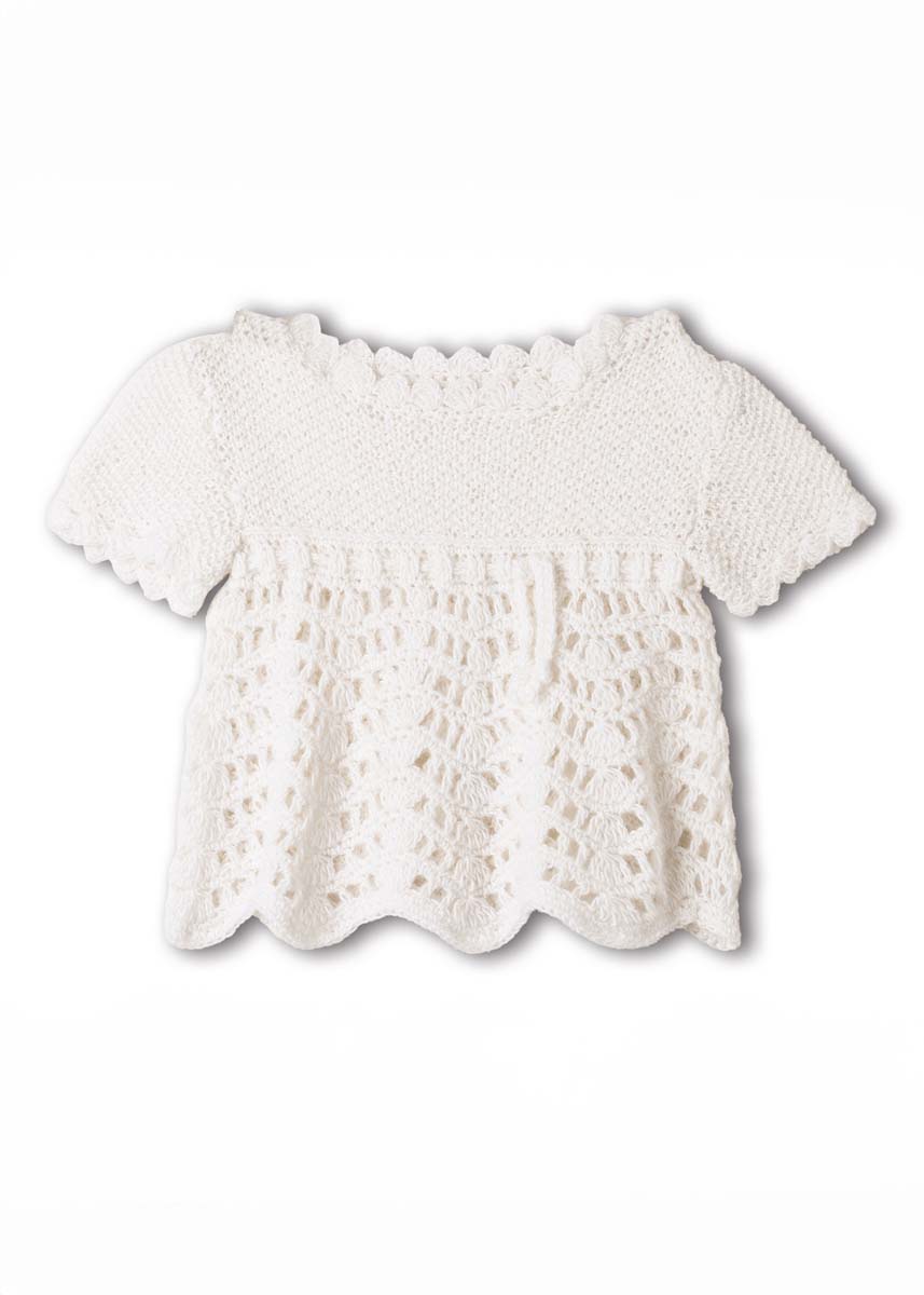 100 (100/150/150) г белой (цв. 207) пряжи Cool Wool Baby (100% шерсти мерино экстрафайн, 220 м/50 г) фирмы Lana Grossa; круговые спицы № 3, крючок № 3; 2 пуговицы диаметром 9 мм.