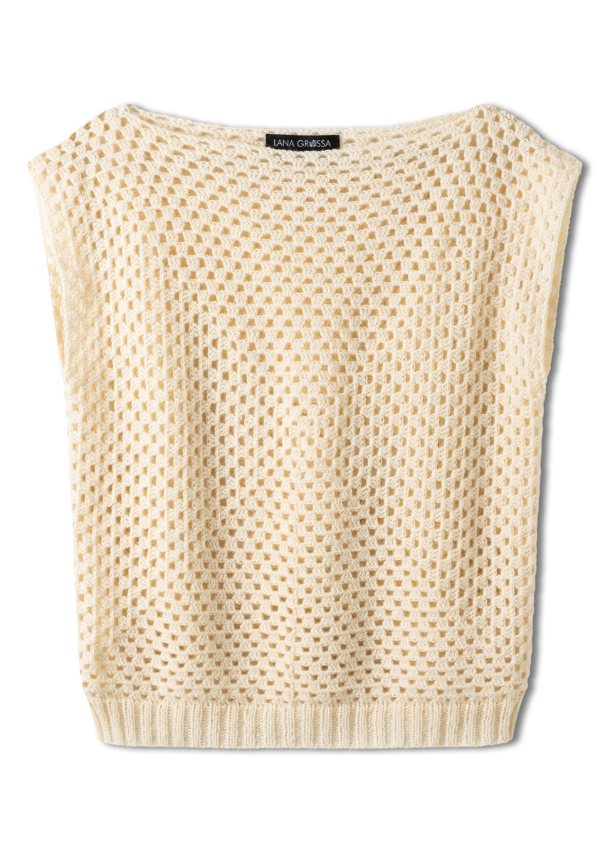 Lana Grossa-Qualität „Ecopuno” (72 % хлопок, 17 % шерсть (меринос), 11 % (беби) альпака, длина нити = ок. 215 m/50 g): ок. 250 (300) г экрю (цв. 46); 1 крючок № 4, 1 кр. сп. № 3,5, 80 см