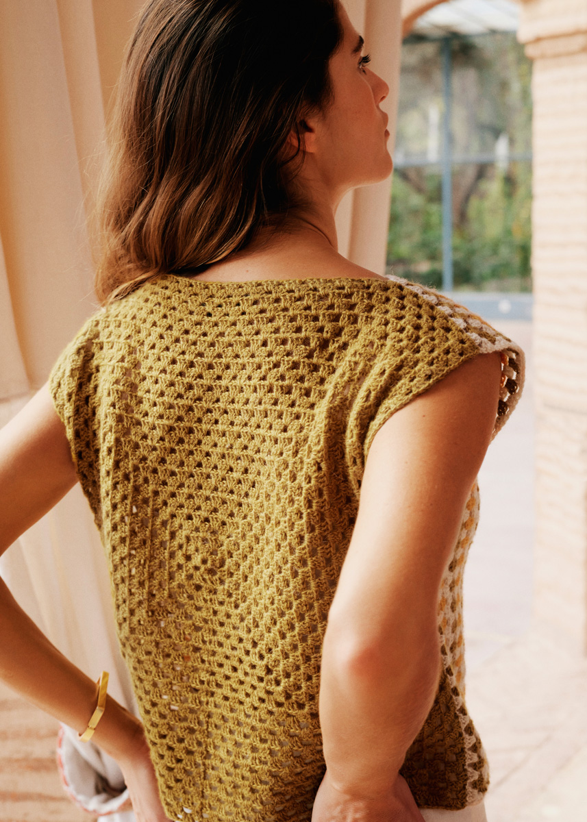 Lana Grossa-Qualität „Ecopuno” (72 % хлопок, 17 % шерсть (меринос), 11 % (беби) альпака, длина нити = ок. 215 m/50 g): ок. 150 (200) г карри желтый (цв. 53), ок. 100 г бежевый жемчуг (цв. 66) и ок. 50 г тёмно-желтый (цв. 80); 1 крючок № 4.