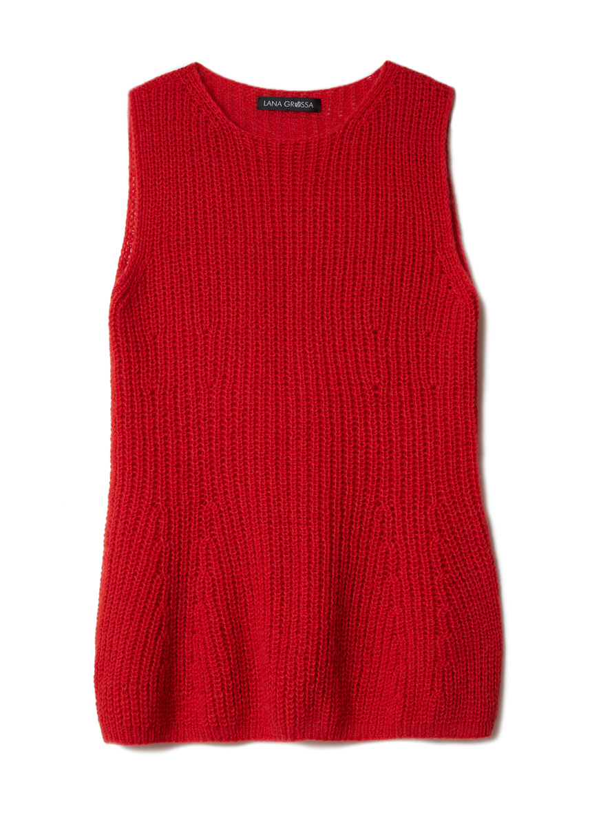 200 (250–250–300) г красной (цв. 100) пряжи Ecopuno (72% хлопка, 17% шерсти мерино, 11% альпака бэби, 215 м/50 г) фирмы Lana Grossa; пря- мые спицы № 3 и № 3,5, короткие круговые спицы № 3; маркеры для петель.