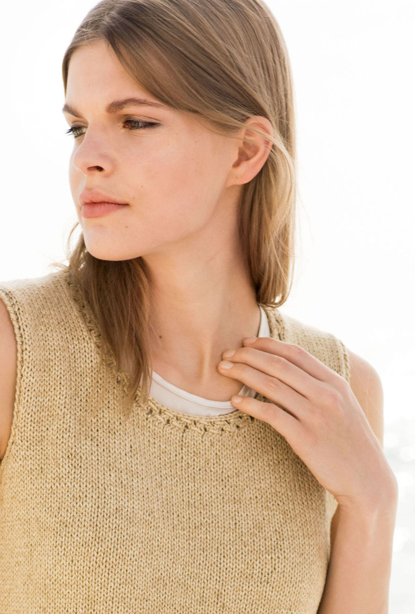 300 (350 – 400) г песочно-желтой (цвет 82) пряжи Linarte фирмы Lana Grossa (40 % вискозы, 30 % хлопка, 20 % льна, 10 % полиамида, 125 м/50 г); прямые спицы № 5 и 5,5, круговые спицы № 4,5 длиной 40 см и 1 вязальный крючок № 4.