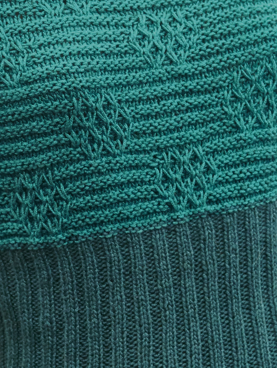 Lana Grossa-Qualität „Linarte” (40% вискоза, 30% хлопок, 20% лён, 10% полиамид, длина нити: 125 m / 50 g): по 200 (250) г темно сине-зеленый (цв. 73) и темно сине- зеленый (цв. 13); спицы № 5, кр. спицы № 4, длиной 60 см, крючок № 4,5