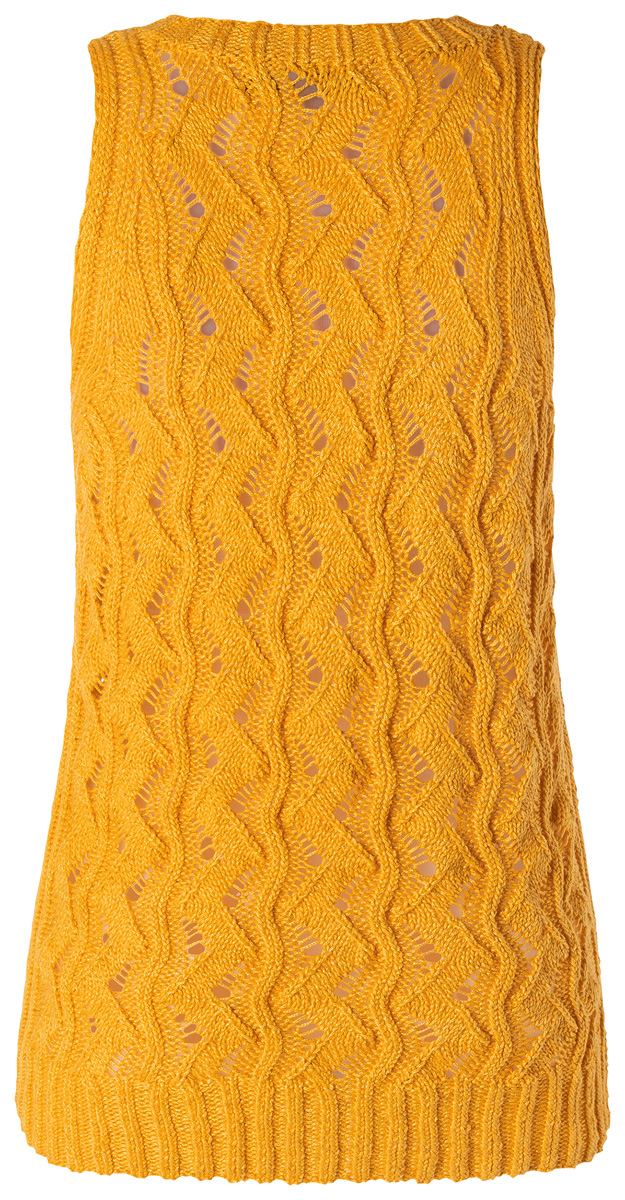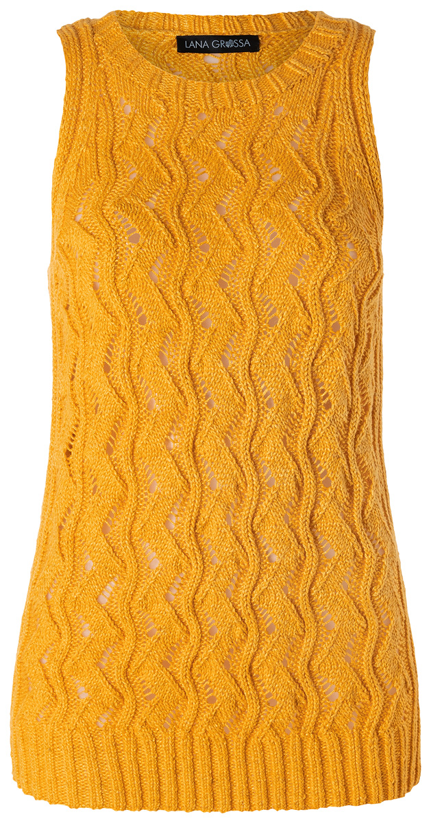 Lana Grossa-Qualität „Linarte” (40 % вискоза, 30 % хлопок, 20 % лён, 10 % полиамид, длина нити = ca. 125 m/50 g): ок. 350 г жёлтый (цв. 307); сп. № 4 и 5, 1 кр. сп. № 4, длиной 50 см
