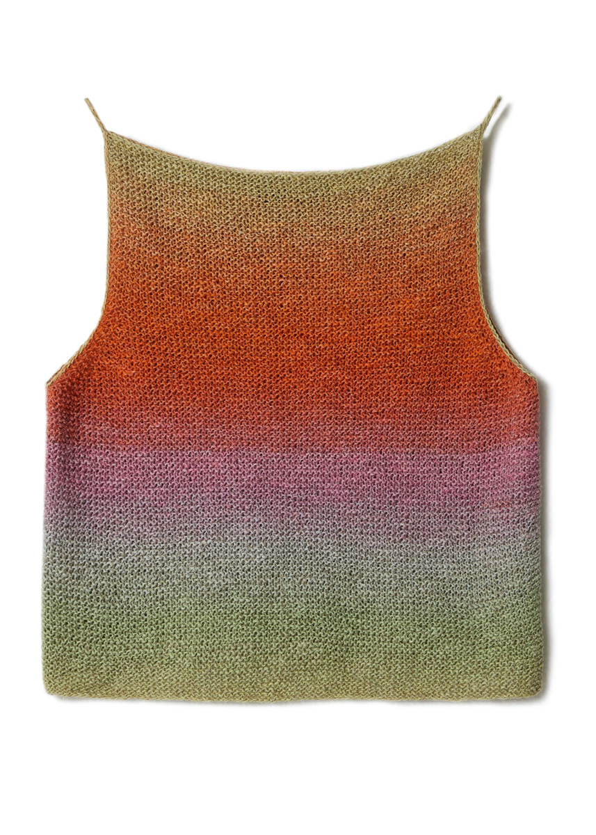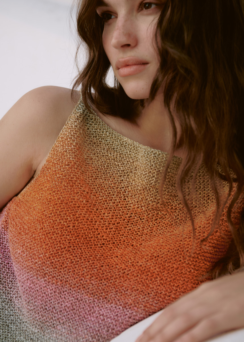 Lana Grossa-Qualität „Mare” (50 % лён, 33 % шёлк, 17 % хлопок, длина нити = ок. 330 m/100 g): ок. 200 (300) г тростник/персик/лососевый/оранжевый/светло- серый/розовый/пинк (цв. 1); сп. № 3, 1 крючок № 3