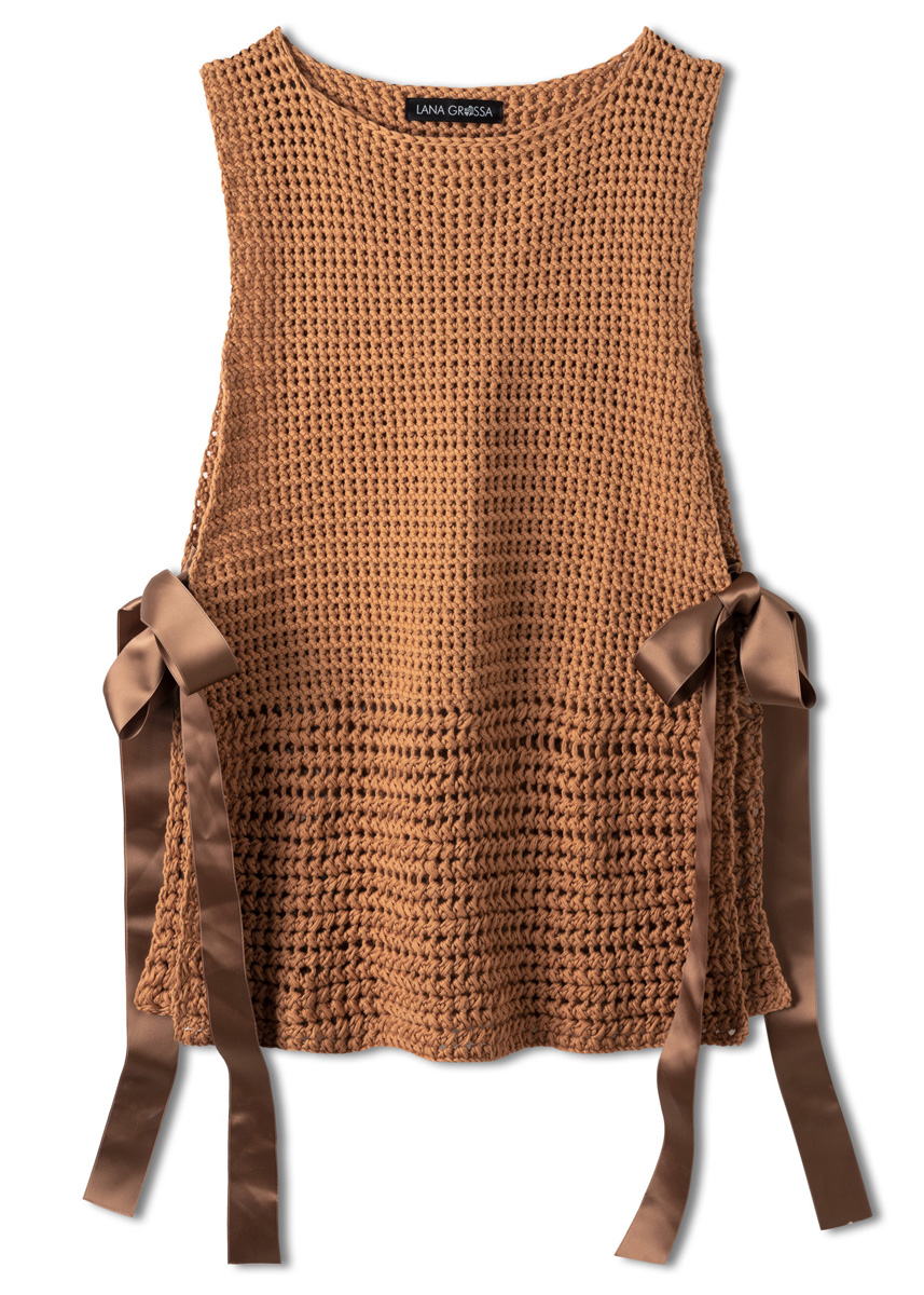 Lana Grossa-Qualität „Organico” (100 % (био) хлопок, длина нити = ок. 90 m/50 g): ок. 400 (450) г легко коричневый (цв. 157); 1 крючок № 4,5; 4 m сатиновая лента золотисто коричневая, 4 см шириной