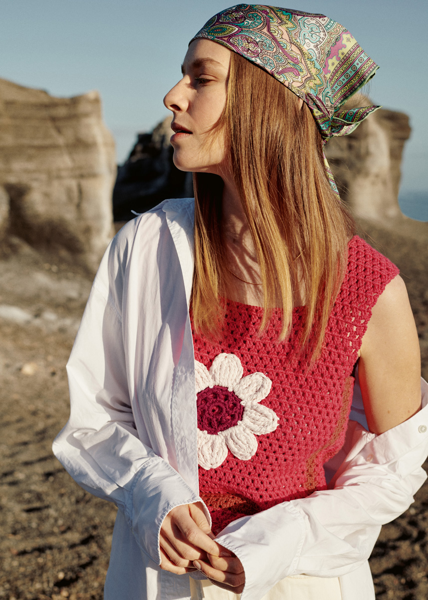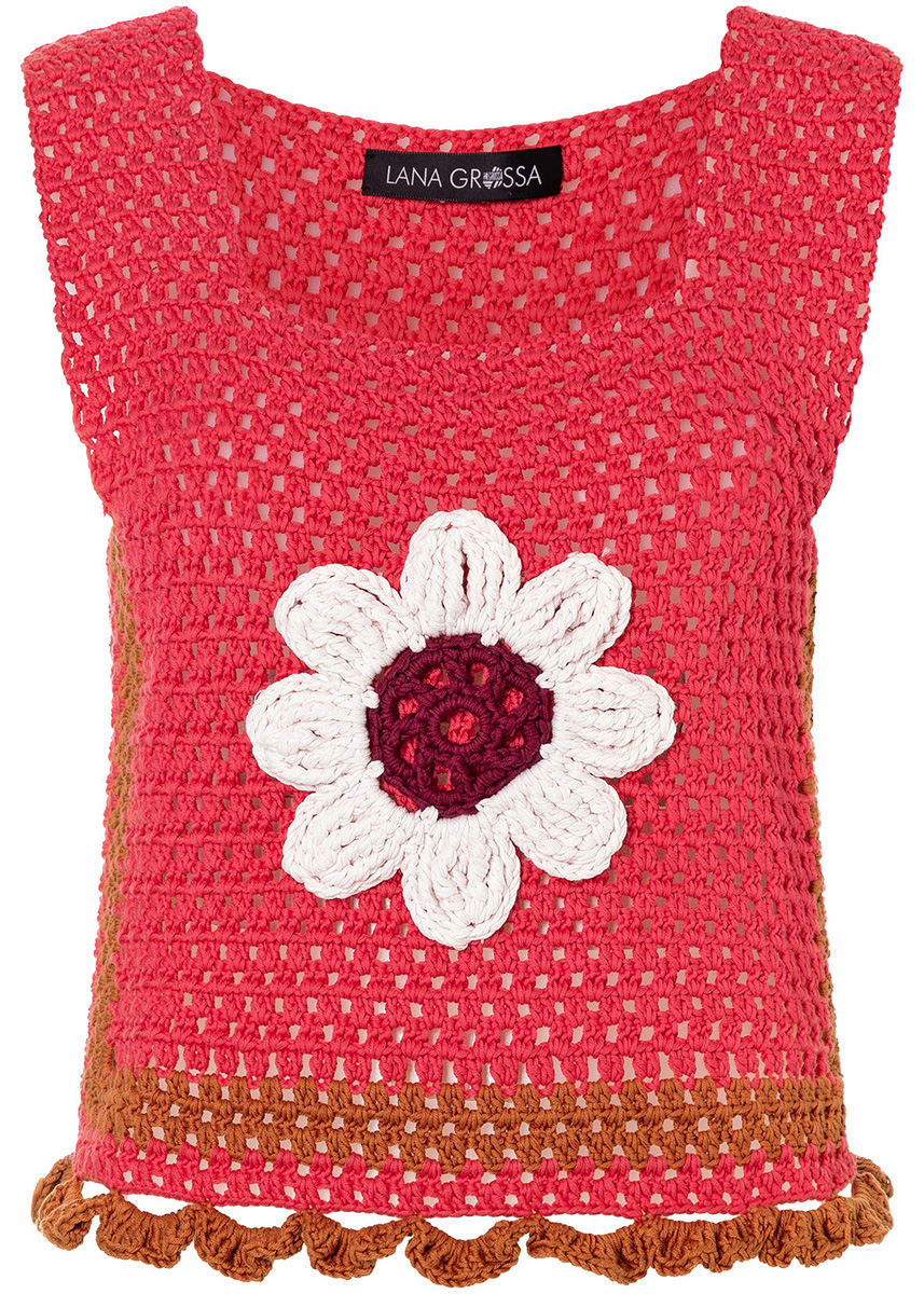 Lana Grossa Pima (100% хлопок (пима), длина нити 125 m/50 g), 200 (250) г (цв 38) и по 50 г красный обожженной глины (цв 43), розовый (цв 29) и красное вино (цв 40); 1 крючок № 3,5 и № 4,5