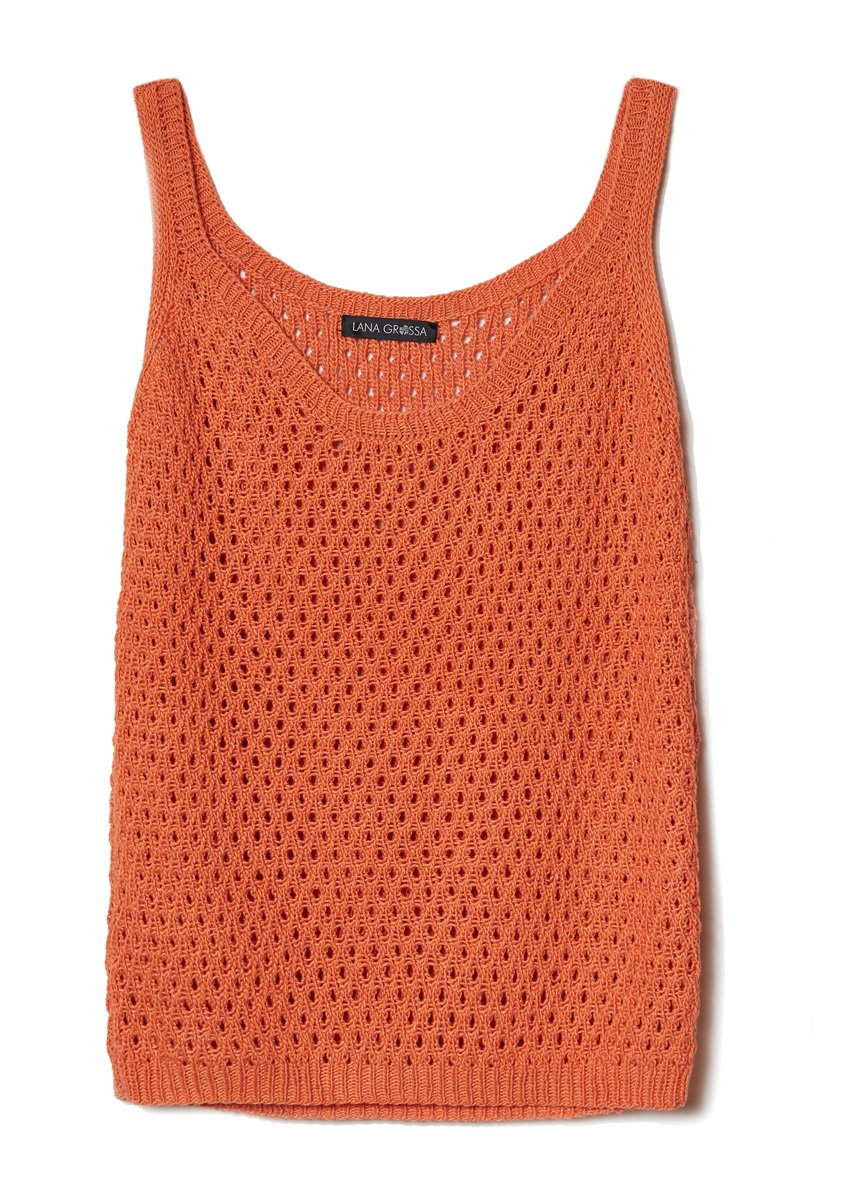 Lana Grossa-Qualität „Solo Lino” (80 % перераб. лён, 20 % лён, длина нити = ок. 120 m/50 g): ок. 300 (350) г лосось оранжевый (цв. 43); сп. № 2,5 и 3, 1 кр. сп. № 2,5, 60 см, 1 крючок № 3.