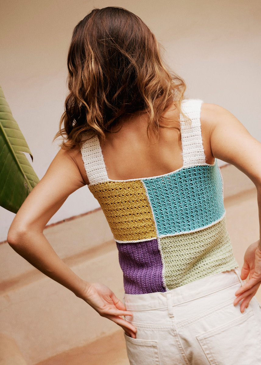 Lana Grossa-Qualität „Solo Lino” (80 % перераб. лён (вискоза), 20 % лён, длина нити = ок. 120 m/50 g): по ок. 100 г светло зелёный (цв. 50), фиолетовая орхидея (цв. 45), бирюзовый (цв. 36), жёлтый (цв. 32) и ок. 50 г белый (цв. 1) и Lana Grossa-Qualität „Per Fortuna” (74 % (био) хлопок, 26 % полиамид, длина нити = ок. 190 m/50 g): ок. 50 г экрю (цв. 8); крючок № 3 и 3,5.