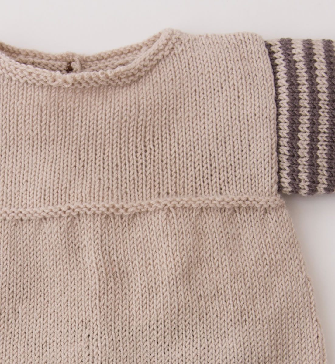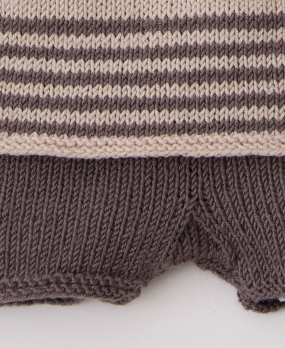 по 50 г серо-коричневой (цвет 211) и цвета грежа (цвет 212) пряжи Cool Wool Baby фирмы Lana Grossa (100 % шерсти, 220 м/50 г); круговые спицы № 3 длиной 40 см, вязальный крючок № 2,5; 1 пуговица и резинка.