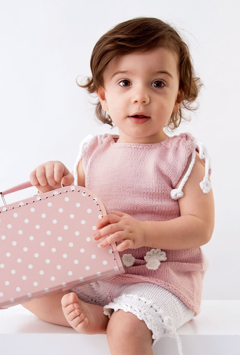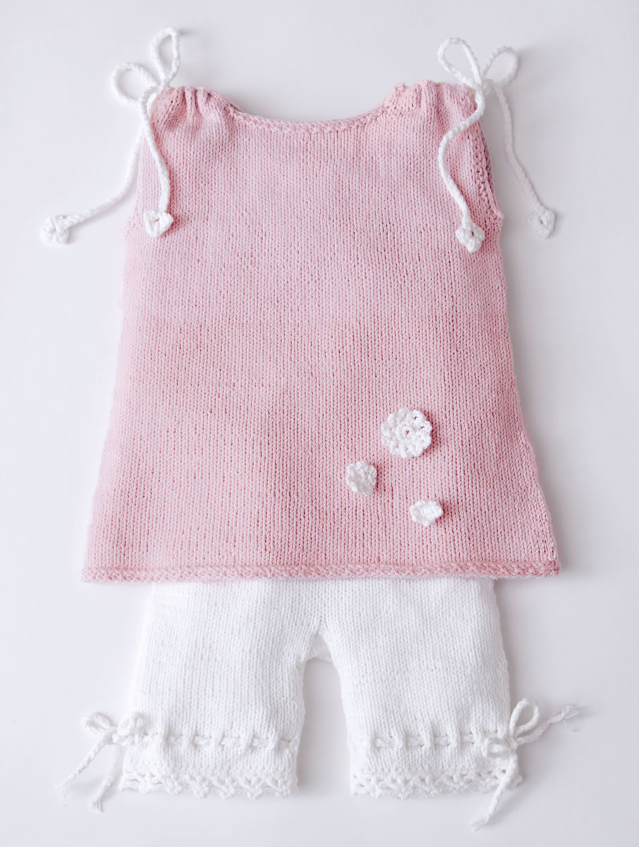 по 100 г цвета экрю (цв. 36) и розовой (цв. 90) пряжи Elastico (96% хлопка, 4% полиэстера (лайкры), 160 м/50 г) фирмы Lana Grossa; прямые спицы № 3,5 длиной 40 см или набор чулочных спиц № 3,5; крючок № 3; эластичная тесьма шириной 2 см.