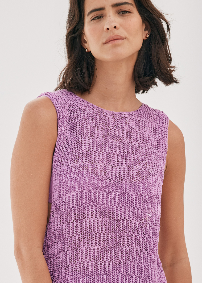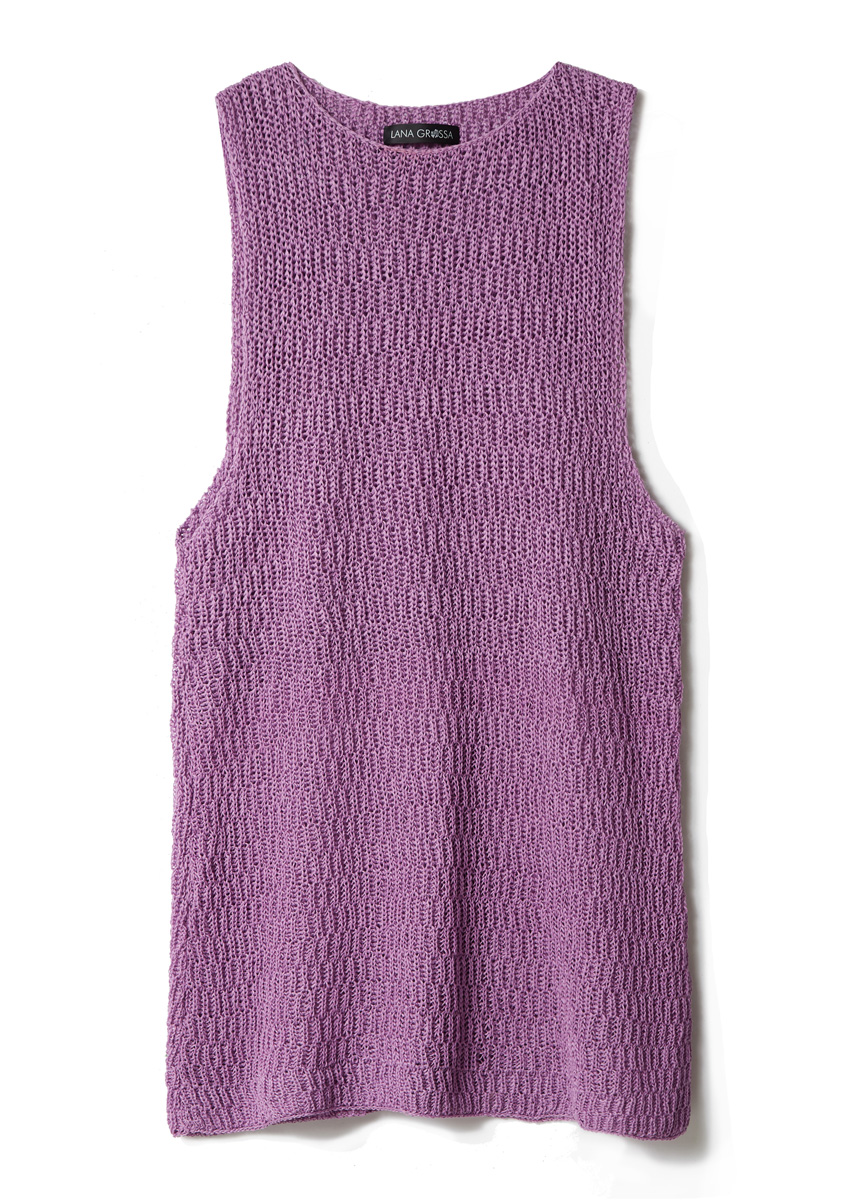 300 (350–400) г лило- вой (цв. 7) пряжи Nastrino (100% хлопка, 190 м/50 г) фирмы Lana Grossa; прямые спицы № 3,5 и крючок № 3