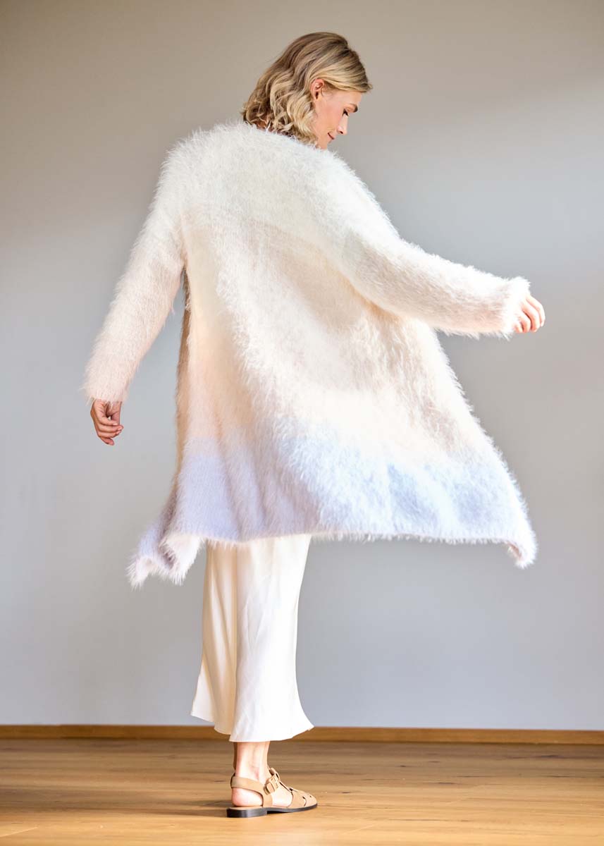 по 200 г светло-бежевой (цв. 2) и бежевой (цв. 3) и по 150 г серебри- сто-серой (цв. 4) и белой суровой (цв. 1) пряжи Basta (50% шерсти мерино, 50% полиамида, 100 м/50 г) фирмы Lana Grossa; прямые спицы № 5, круговые спицы № 6 длиной 80 см; 5 бело-бежевых перламутровых пуговиц диаметром 25 мм