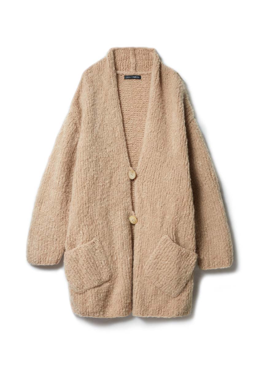 450 (500–550) г беже- вой (цв. 11) пряжи Royal Alpaca (93% альпака royal, 7% полиамида, 95 м/50 г) фирмы Lana Grossa; прямые спицы № 7 и № 7,5, крючок № 7; 2 бежевые пуговицы диаметром 35 мм.